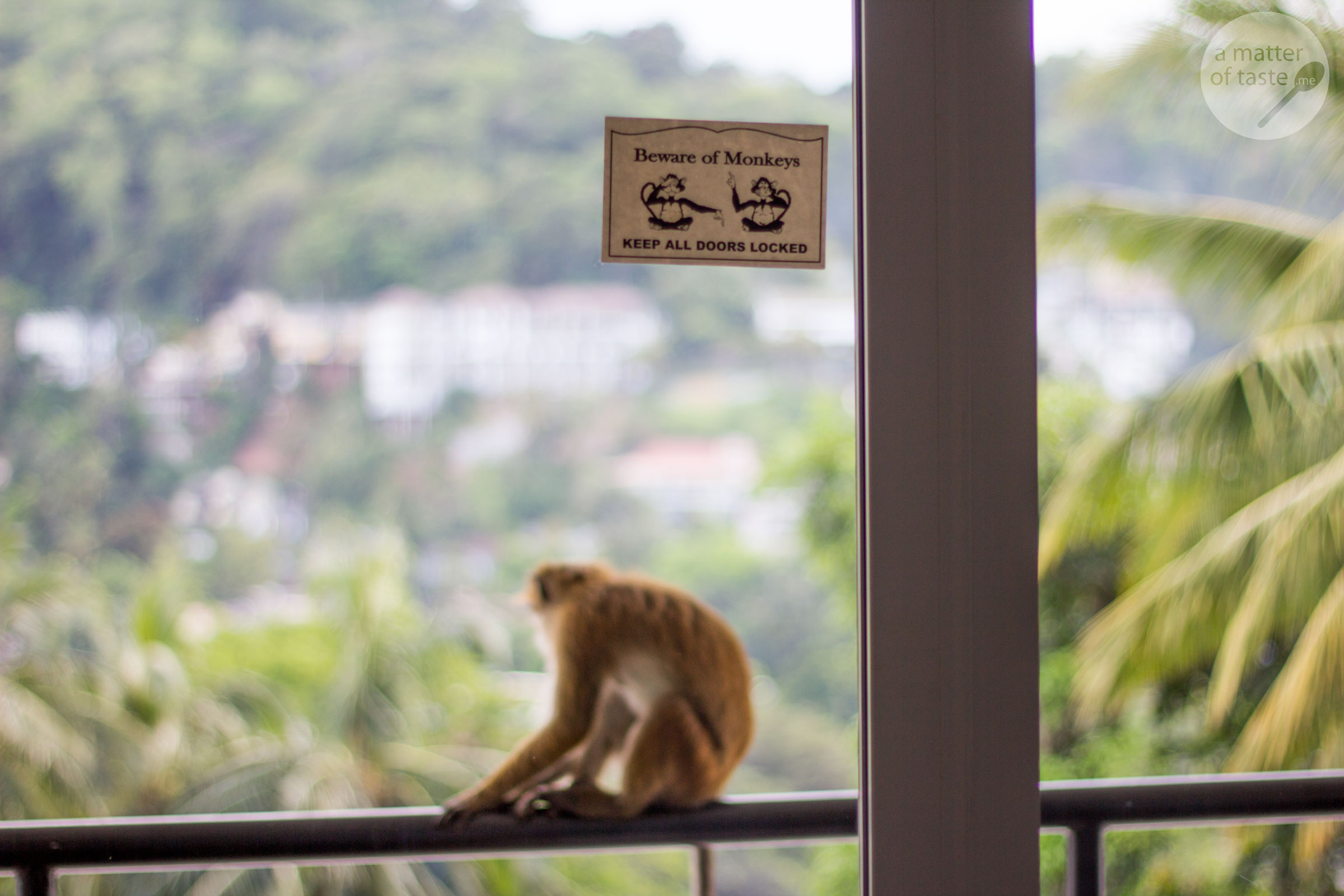 Beware of monkeys. Keep all doors locked – A sticker on our balcony doors warned us. Are you kidding me? I can’t wait to see those monkeys! And I didn’t have to wait long. At one moment there were at least 10 of them, all very keen to break into our room and steal my red-capped can of mosquito repellent. They had their eyes set on it all the time and I had my chance to take some close up pictures. What a great cooperation.
