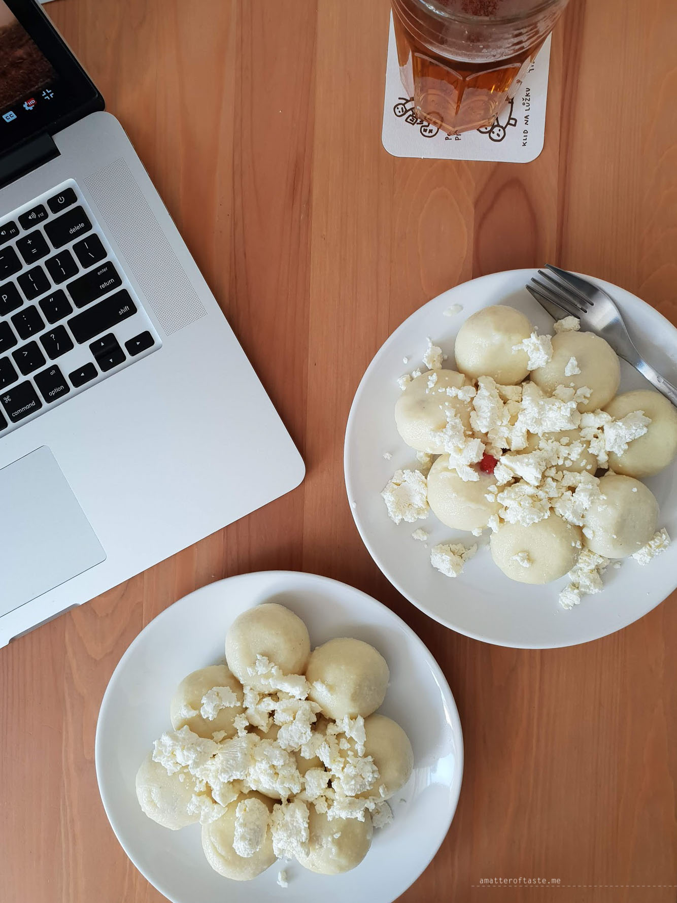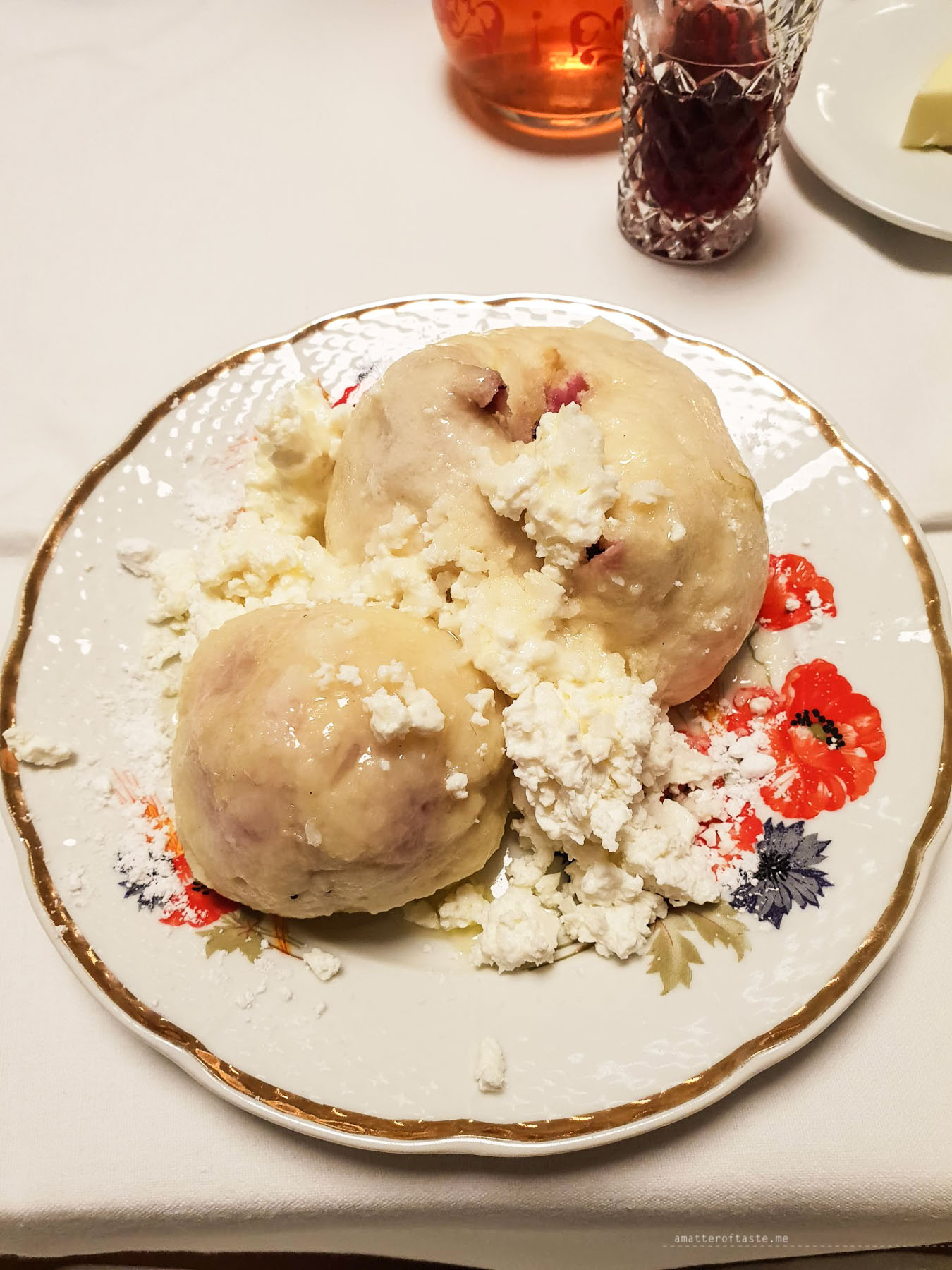 Boiled, ball-shaped dumplings filled with fruits. Often served with sweetened cottage cheese on top. The dumpling dough can be made with potatoes, which isn’t as dry as a regular one. Similar to Polish pierogi with fruits, they have a quintessential summer taste to me.