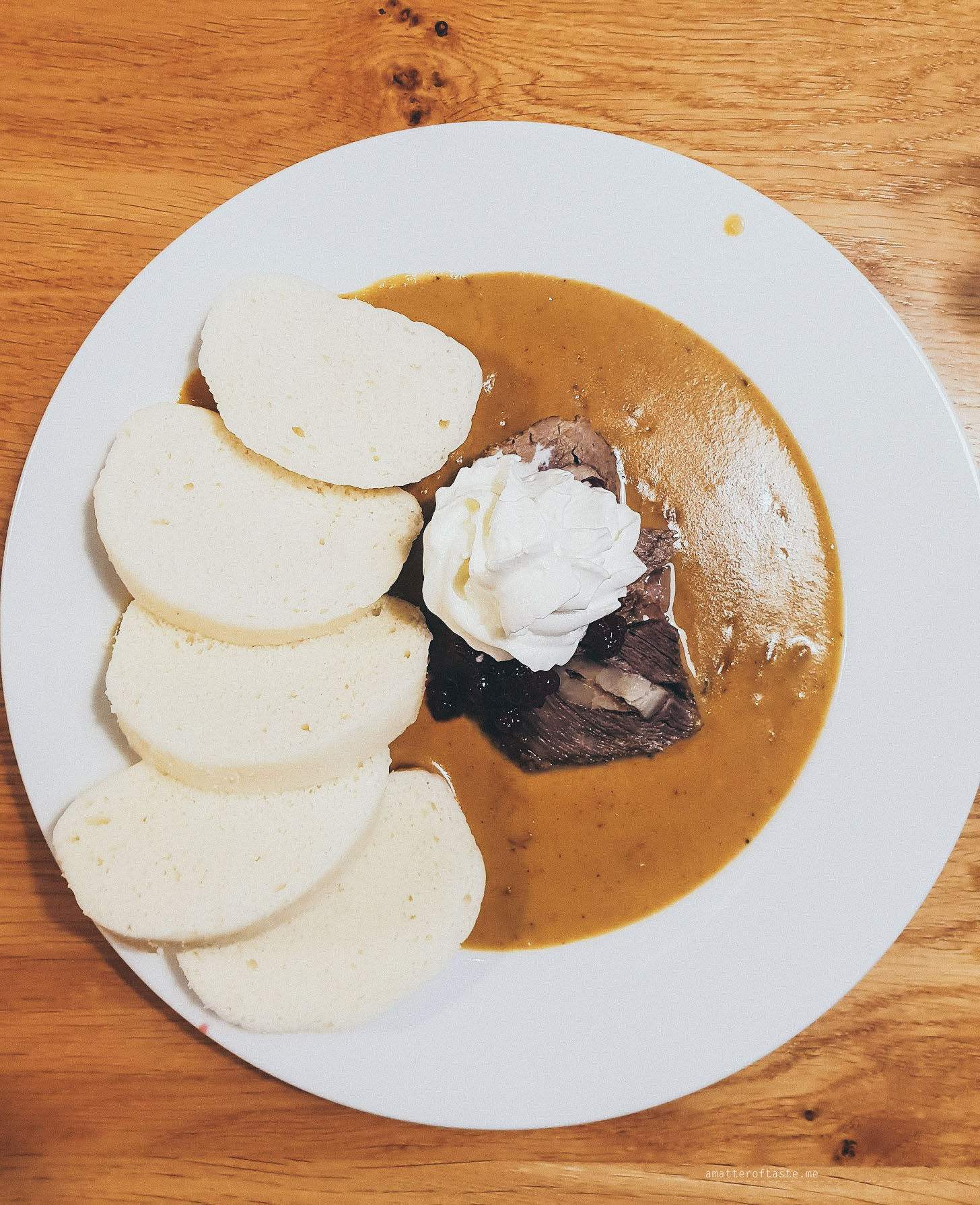 One of the most popular Czech dishes, svíčková na smetaně, is a beef sirloin with cream sauce and bread dumplings. The sauce is slightly sweet and thick, meat slow cooked, the bread dumplings soak up the sauce beautifully. The dish is simple, comforting and goes great with beer.