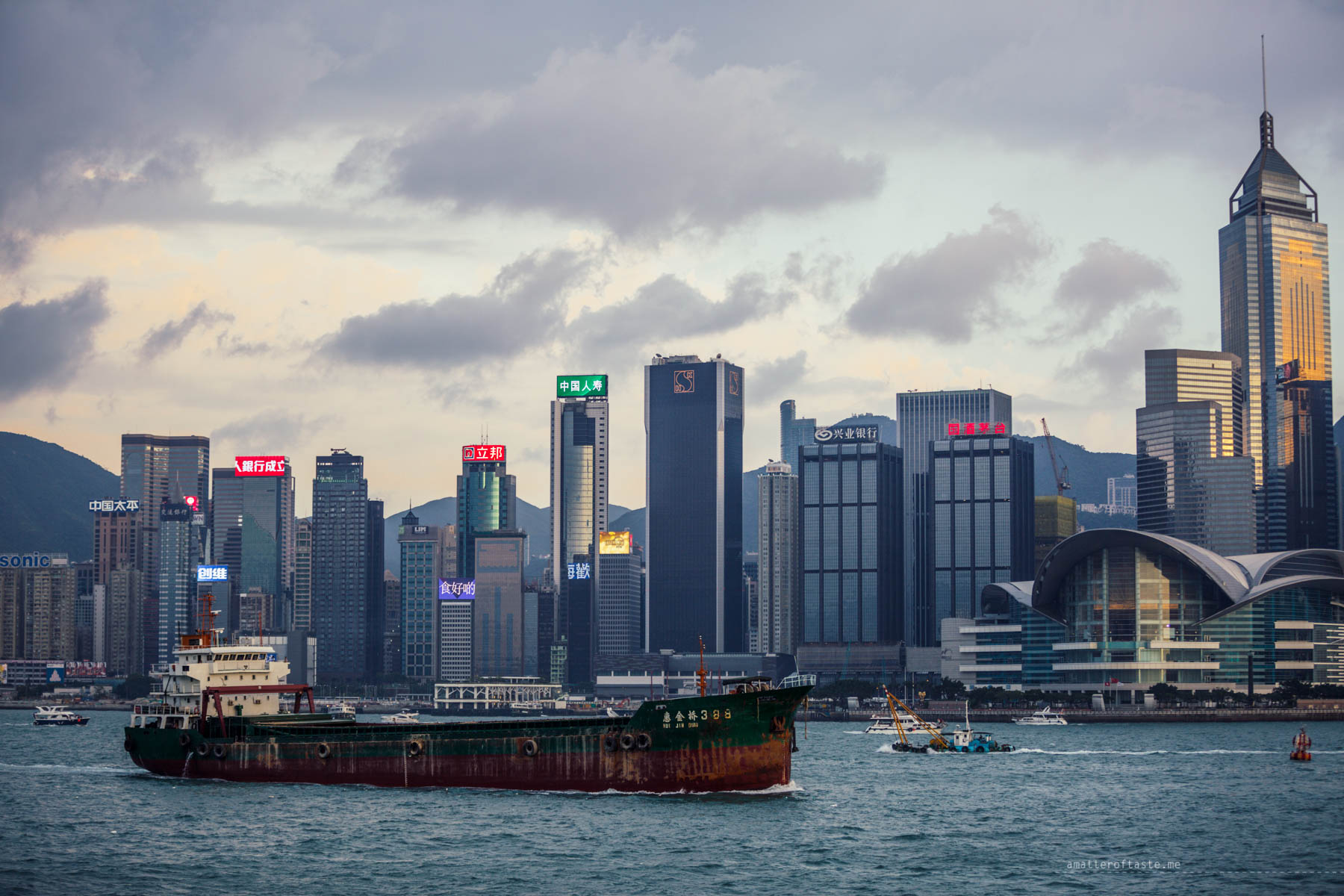 It took us about 25 minutes to reach Hong Kong central station. From there we walked to the waterfront and were already very happy with our choice – instead of spending about 30 hours in airplanes and airports we were able to walk outside, breathe fresh air (as fresh as it gets in Hong Kong) and help our bodies deal with jet lag by soaking up the sun and watching a lovely sunset.