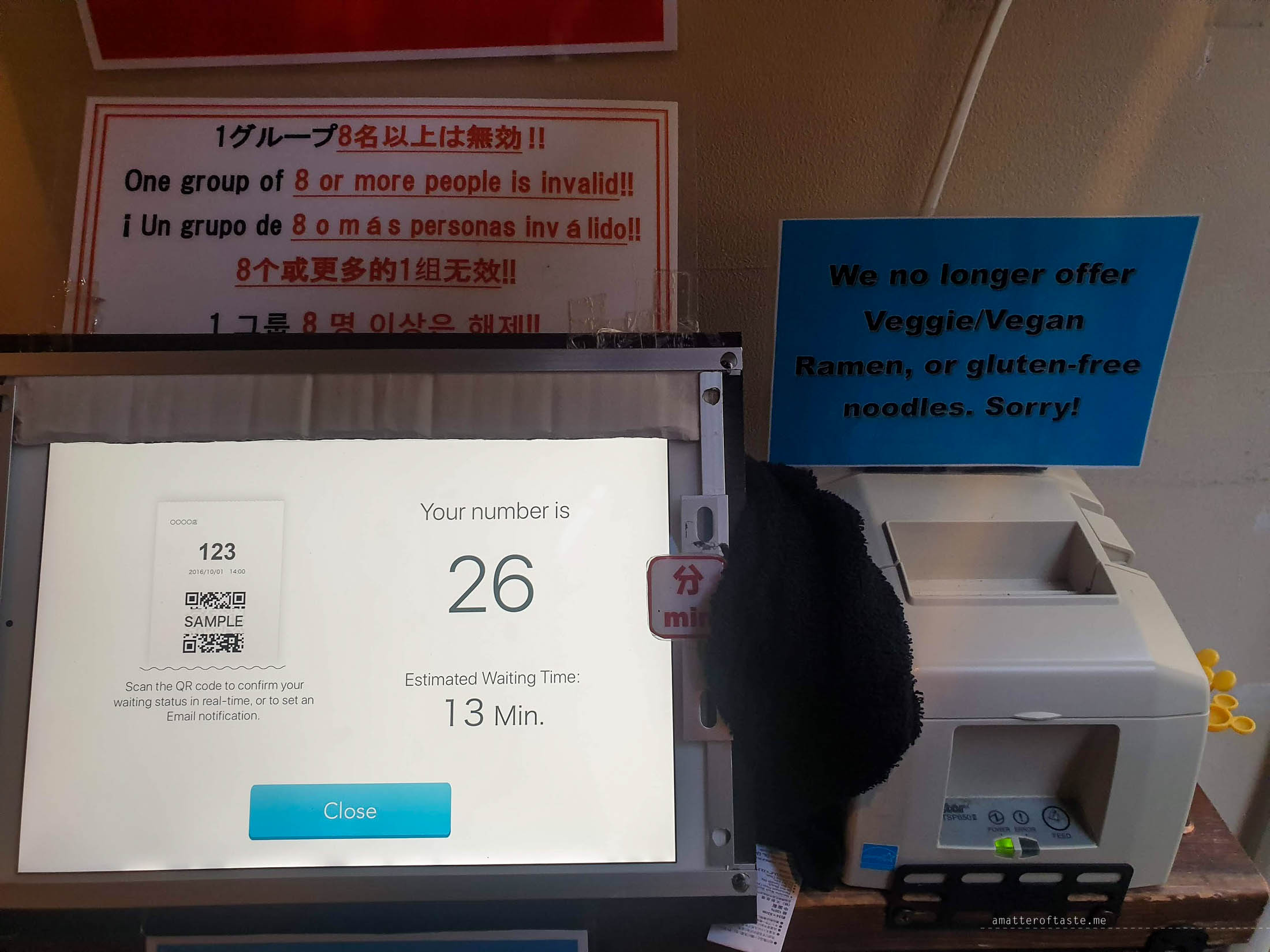 During lunch & dinner times the lines are long as the restaurant doesn’t accept reservations. But there is a ticketing system in place which you can connect to your phone and wander around while you wait for your turn. If you don’t mind moving your meal times around a bit come in the afternoon – we visited around 4pm and didn’t have to wait.