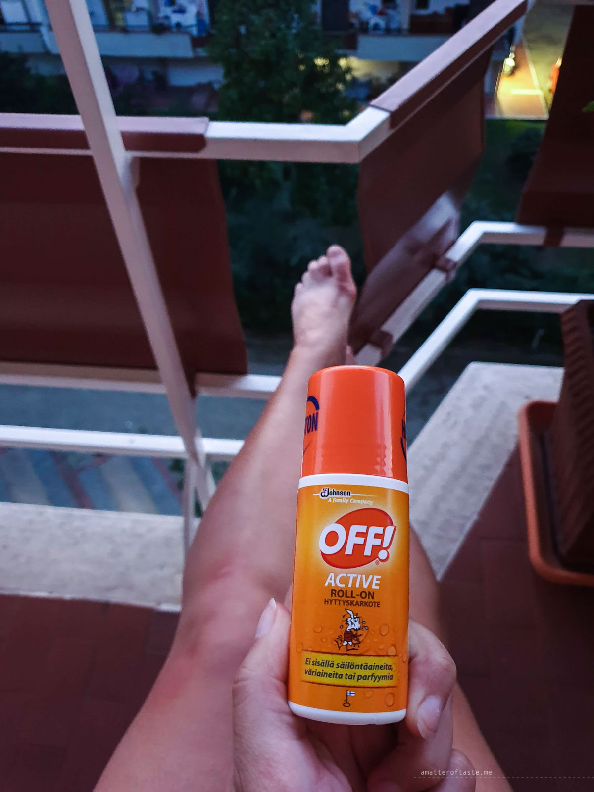 Who would have thought I’d be struggling with mosquitos in Florence of all places? We didn’t have that problem in Finland, where we expected it to happen. They got me in Italy though. They were big and hungry. Every time I wanted to eat dinner on the balcony I had to use my Finnish-strength repellent. Hubby was fine as long as I was around. Mozzies just love me.