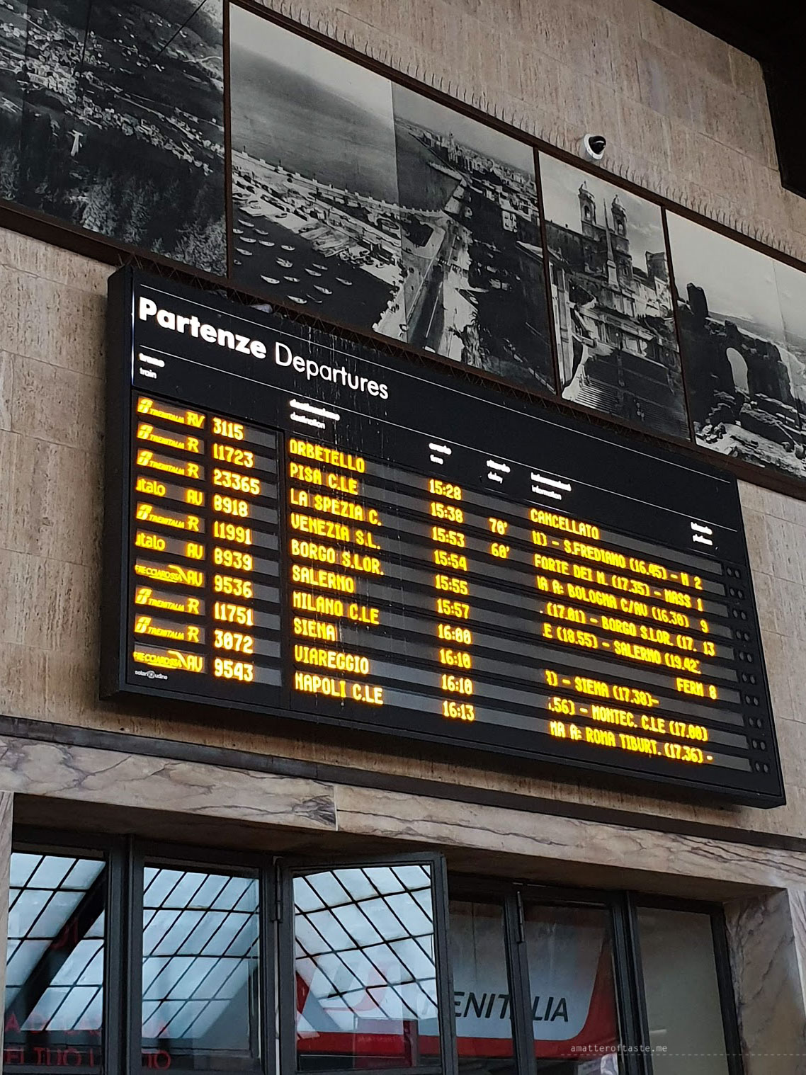 Trains are often delayed. When we were waiting for info about our train, some that were already up on the board had 70 minutes delay. And speaking of boards – Firenze S. M. Novella, the main train station in Florence, displays departure on a board at the very last minute before the departure. Up until 4 minutes till departure time, you wait with a group of people with your head up and eyes fixed on that one spot. Once it shows the number, it’s a mad rush to the platform.