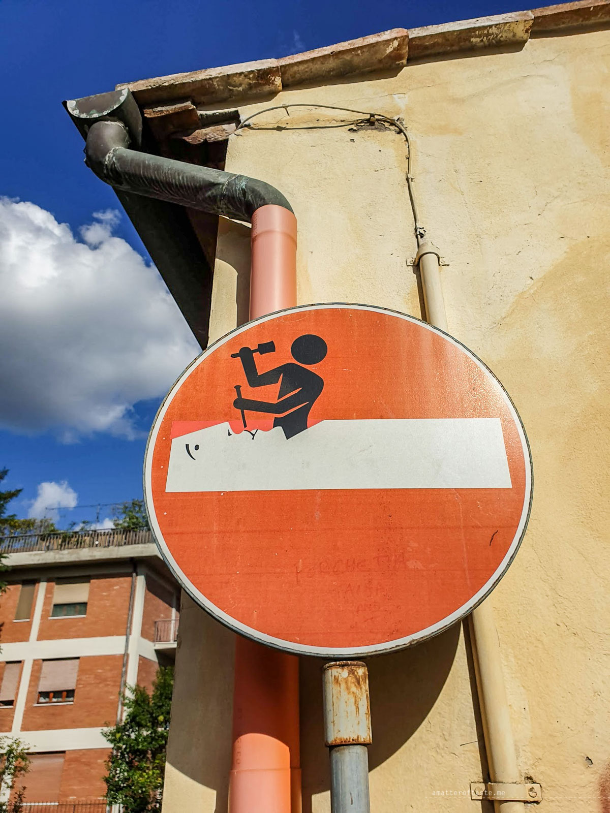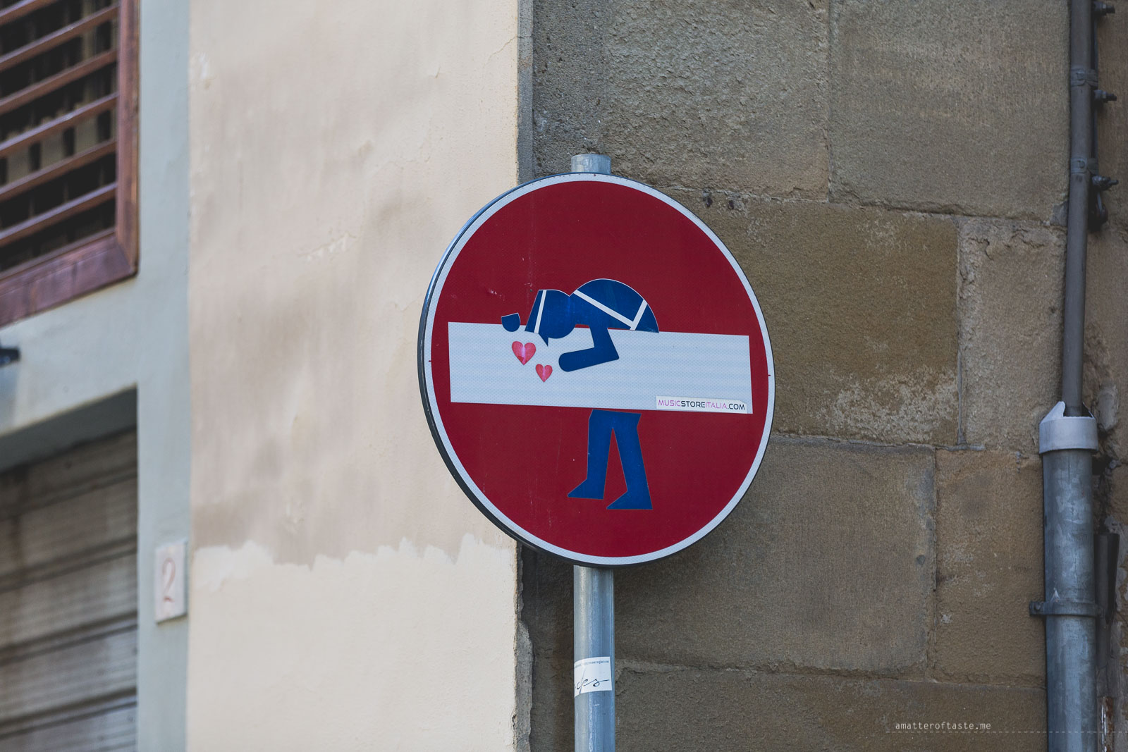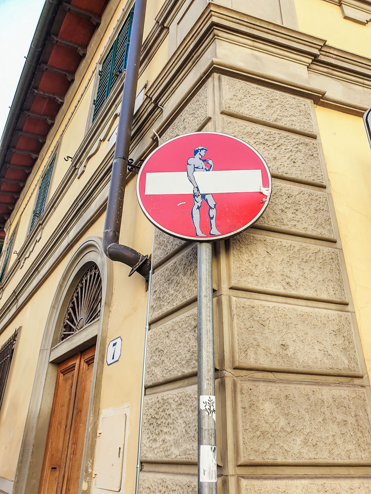 There wasn’t much in the street art department (which makes sense, you wouldn’t slap a mural on a historical building) but for those who look there are things to find. Street signs! Similar to the ones in Madrid but designed by Clet.