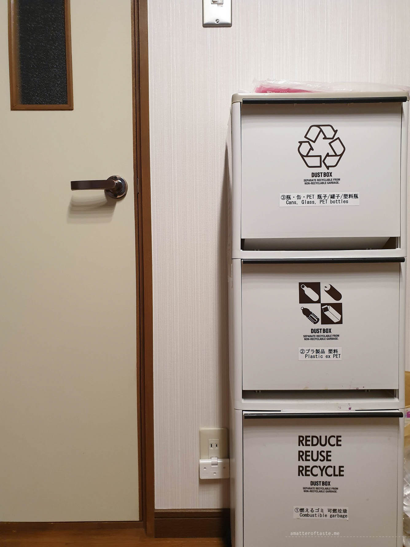 Recycling at home is a big deal. People often have more than 3 different bins for different items. Our Airbnb host made things easy for us and we only had to separate pura プラ (plastic), glass and cans. The rest went to one bin. They also picked it up from us weekly so we didn’t have to be bothered with the rubbish pick-up schedule in our area.