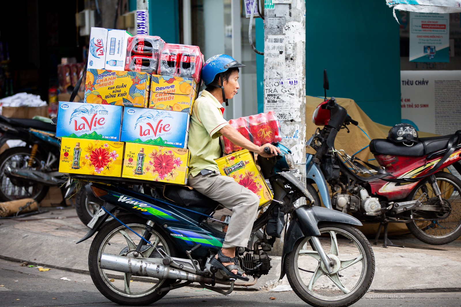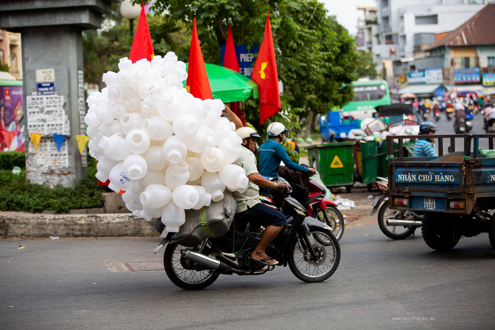 We learned you can transport just about anything on a motorbike: a whole 5-person family, a table, a couple of large speakers, 10 huge bottles of water…full, guitars, suitcases, 6 crates of beer, 4 TVs, a fridge, a washing machine. Everything is possible.