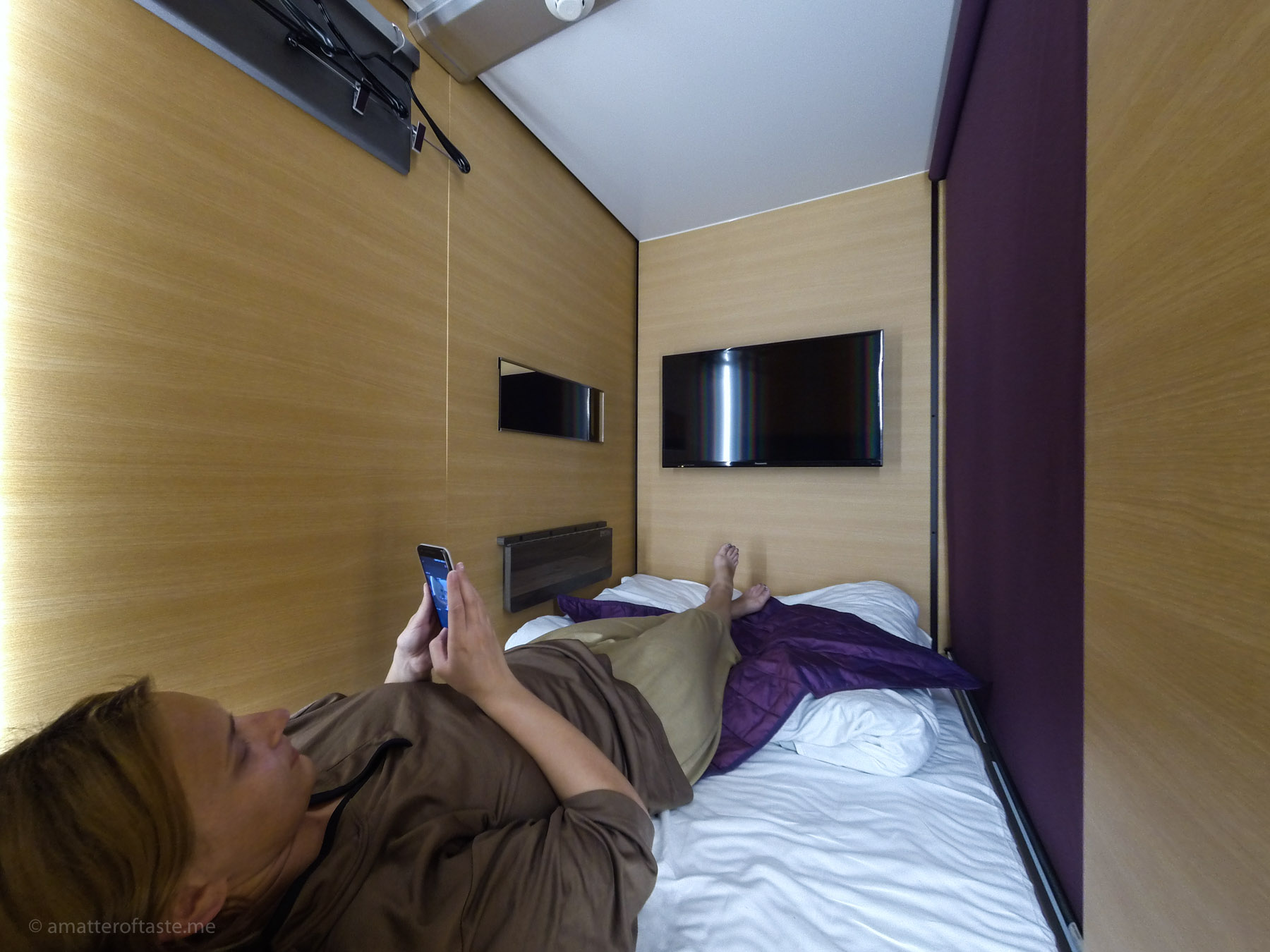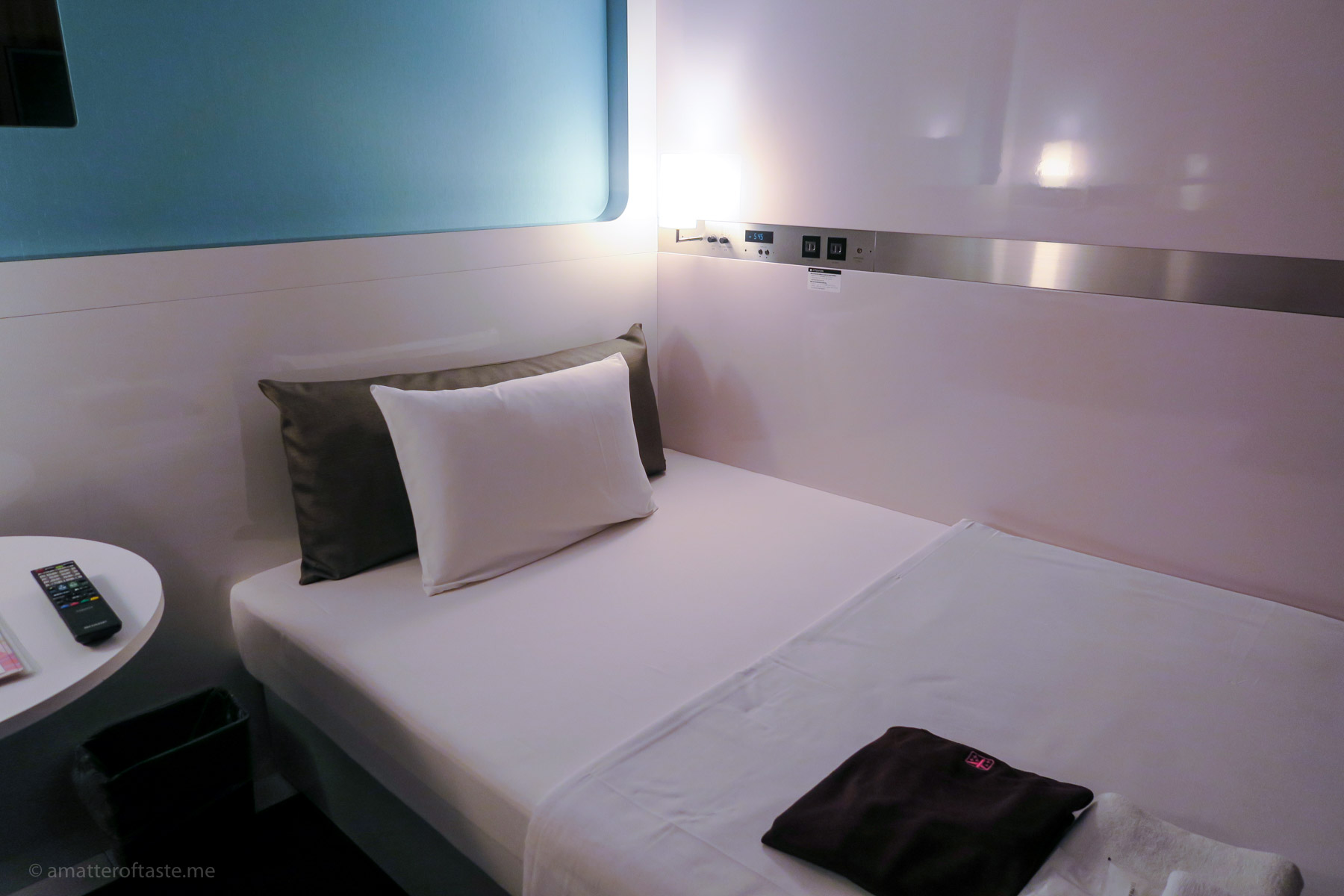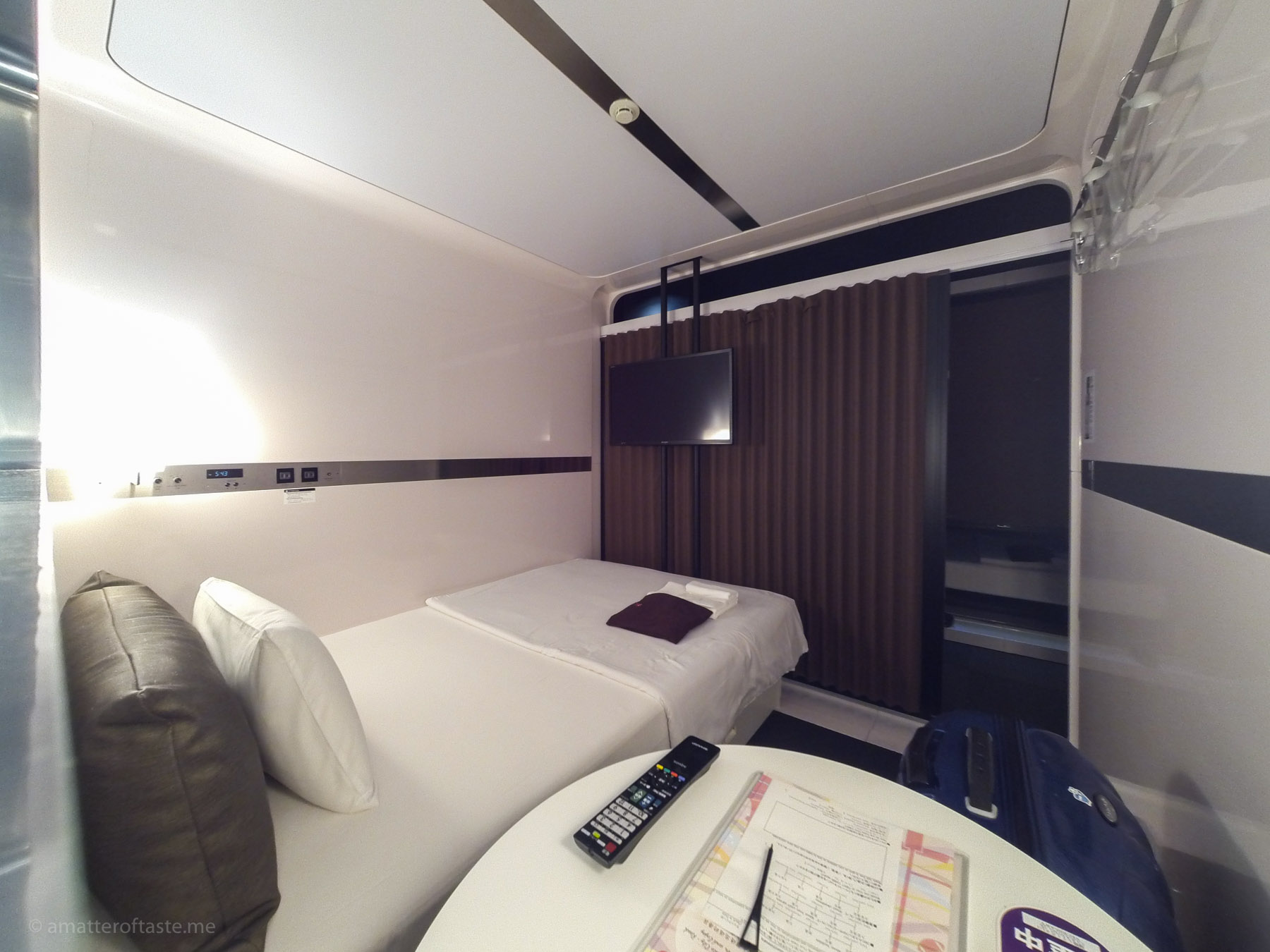You won’t have your luggage with you in the capsule. It’s stored safely in the locker provided so you need to think ahead of time what clothes you may need the next morning and make sure you have your phone & camera chargers with you in the pod. Also, consider your separation anxiety (I’m one of those people who like to keep an eye on their belongings at all times).
