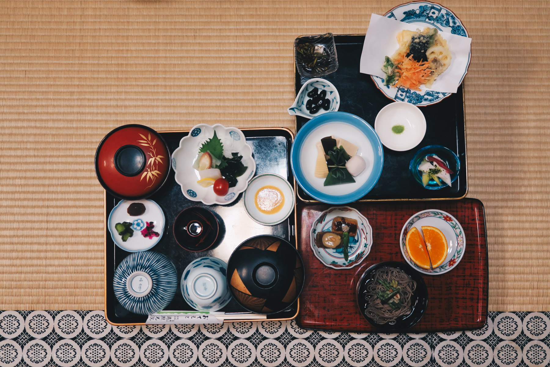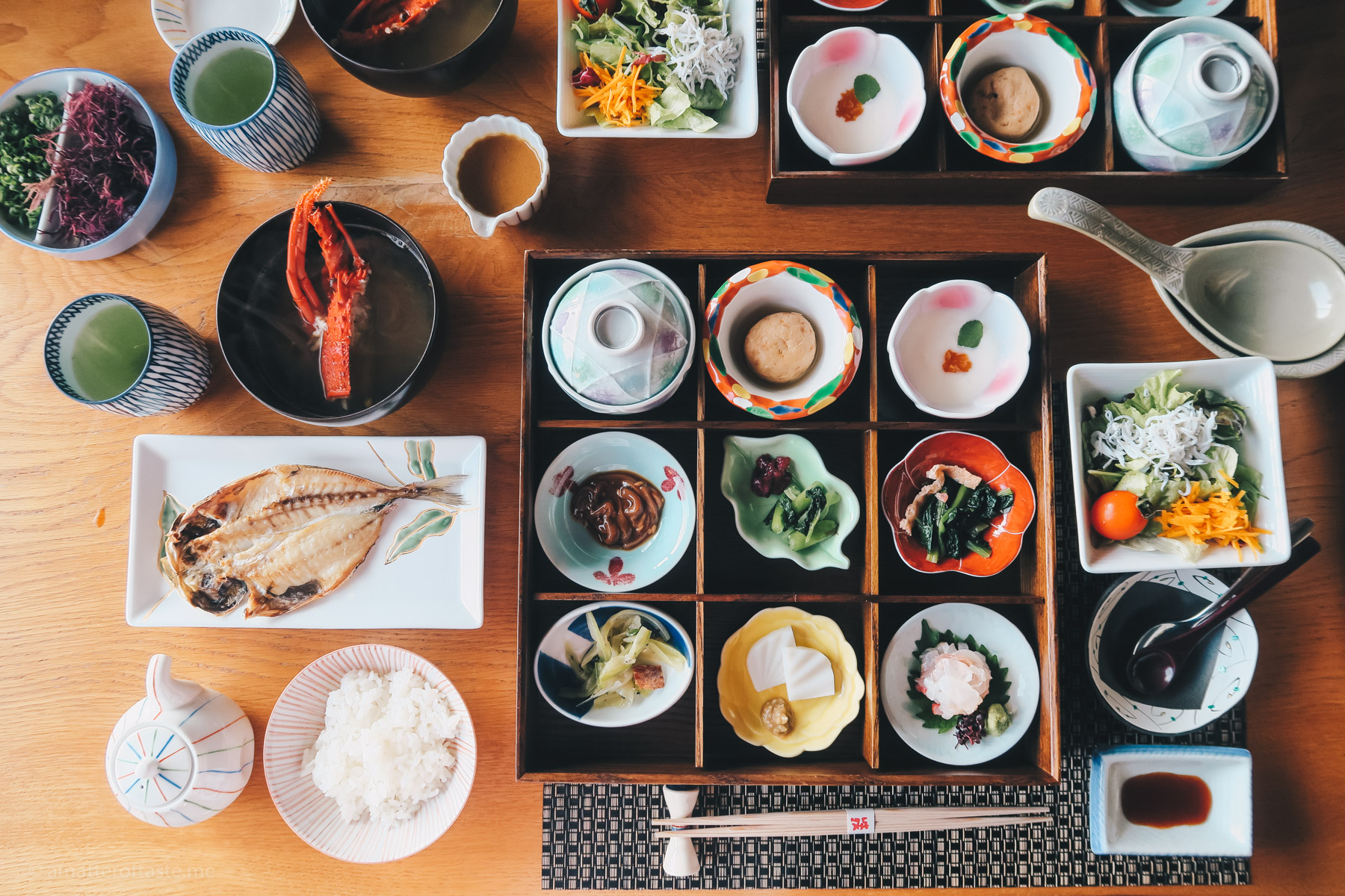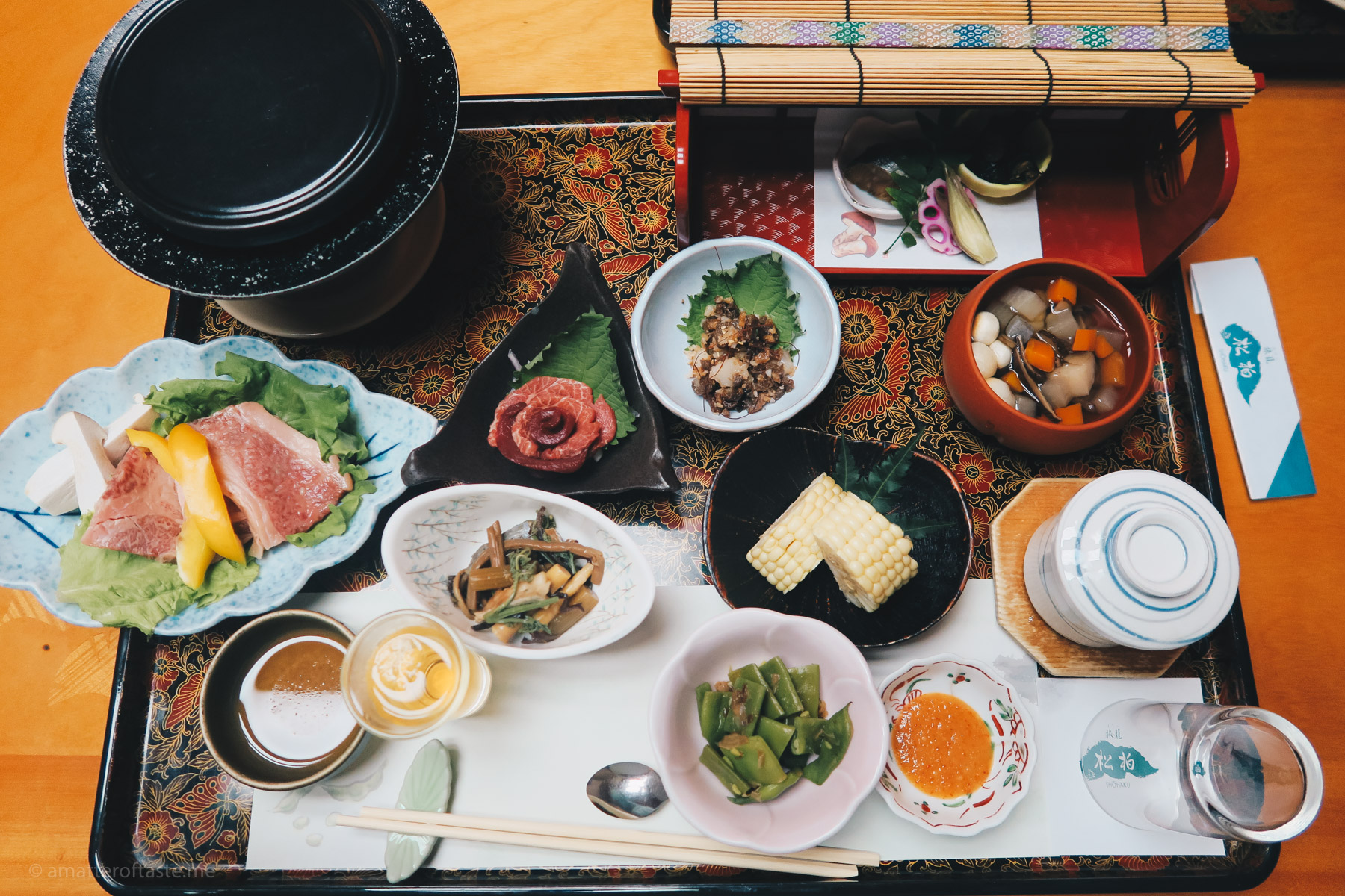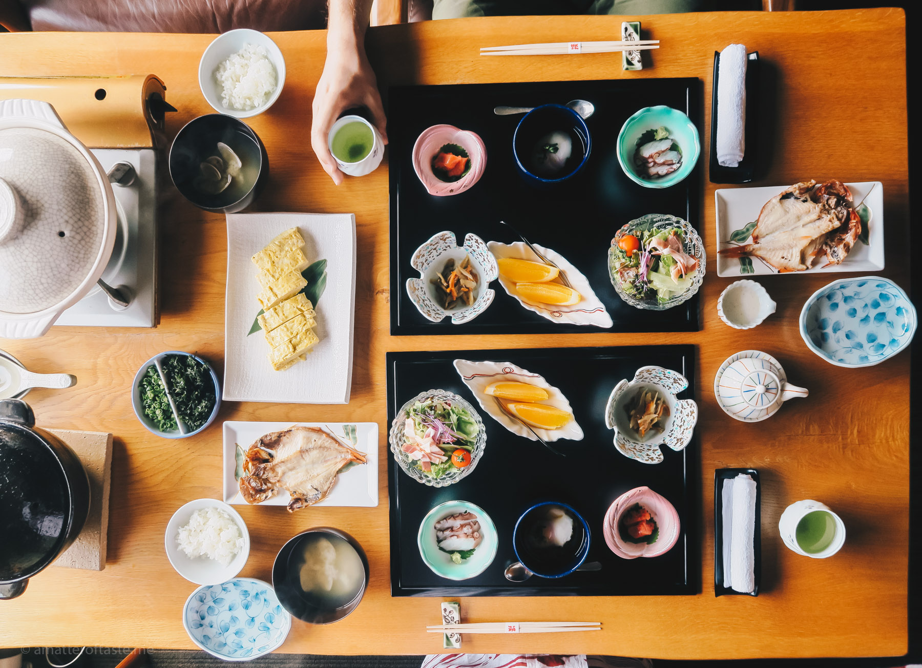 Let me start with the food. Most ryokans have food (dinner and breakfast) included in the price. Both, or at least the dinner, are served in your room, are elaborate and should be considered a form of art. Local, seasonal produce shines in the menu. If you’re staying in a coastal area (for example Isaribi in the Izu Peninsula) you’ll get a lot of seafood, inland it will be more about vegetables and meat (like at Hatago Shohaku near Koriyama).