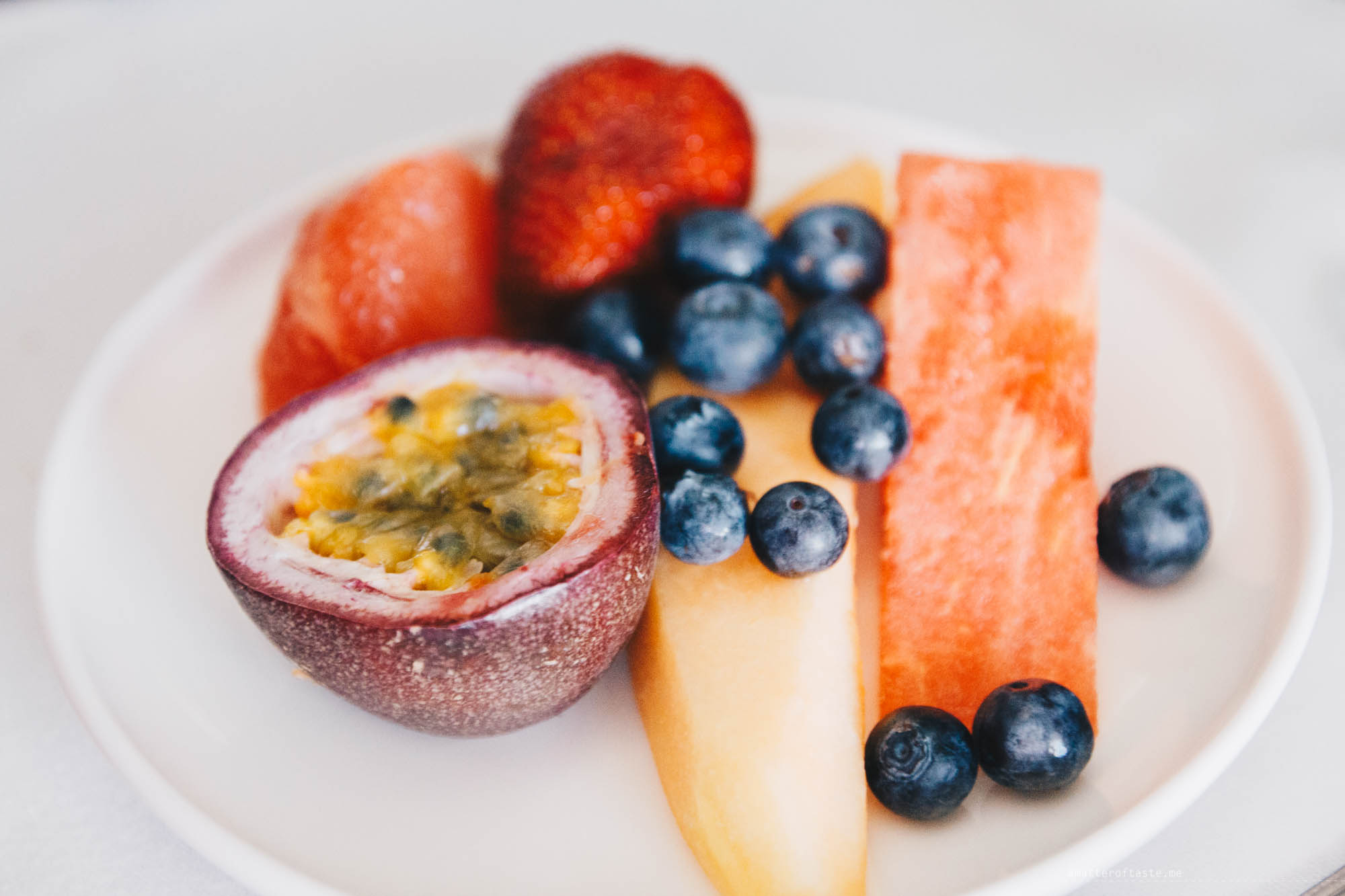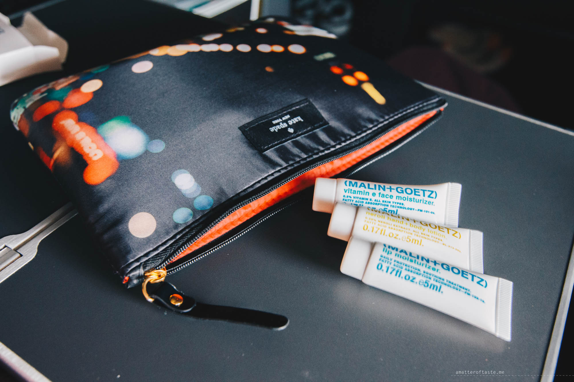 – Welcome Mrs and Mr Kozmic, would you like some champagne before we take off? – can I start all my flights with some champagne, please? And while we waited for that (no longer than 2 minutes) I looked around – lots and lots of storage, very generous legroom and some of my favourite magazines waiting to be read. Together with champagne, we were given lovely Kate Spade bags with toiletries, different looking for Man and Woman, menus designed by Neil Perry and were introduced to our flight attendant (who, small world indeed, turned out to be not only lovely and attentive but also Polish-born like us).