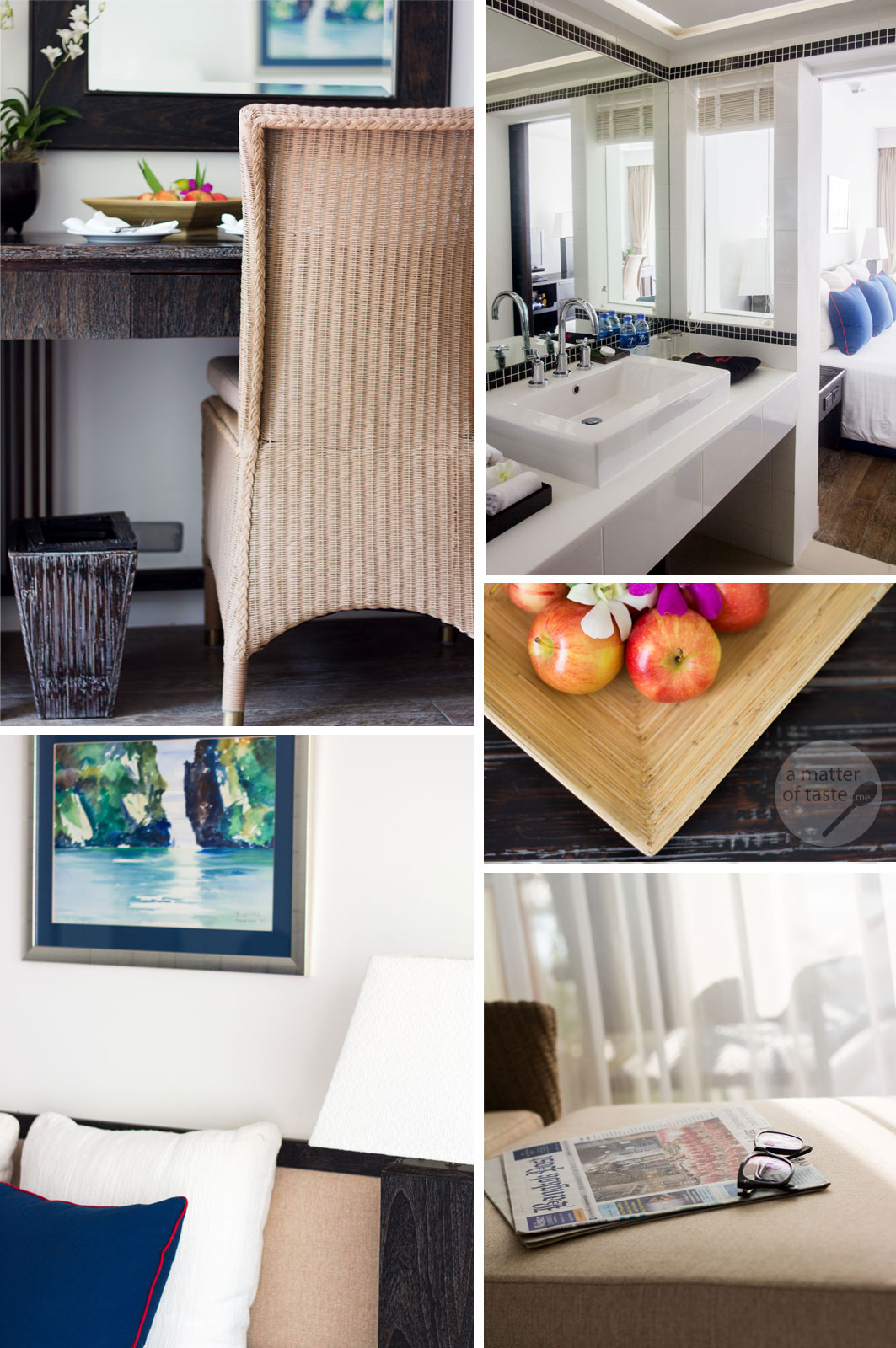 Our room on the ground floor was convenient, only few steps to the pool area, beach and restaurant. It wasn’t the biggest but very tastefully decorated. I loved the marine theme and colours surrounding me there: navy blue pillows, delicate watercolour paintings, wooden floor and lots of white – it felt warm and classy.