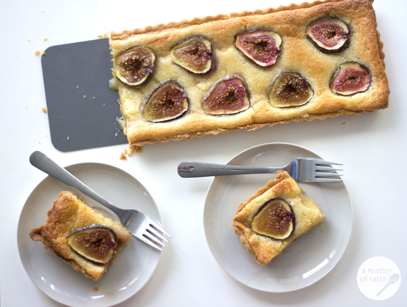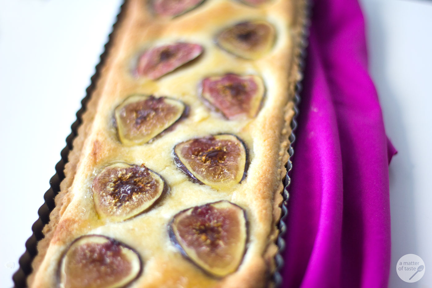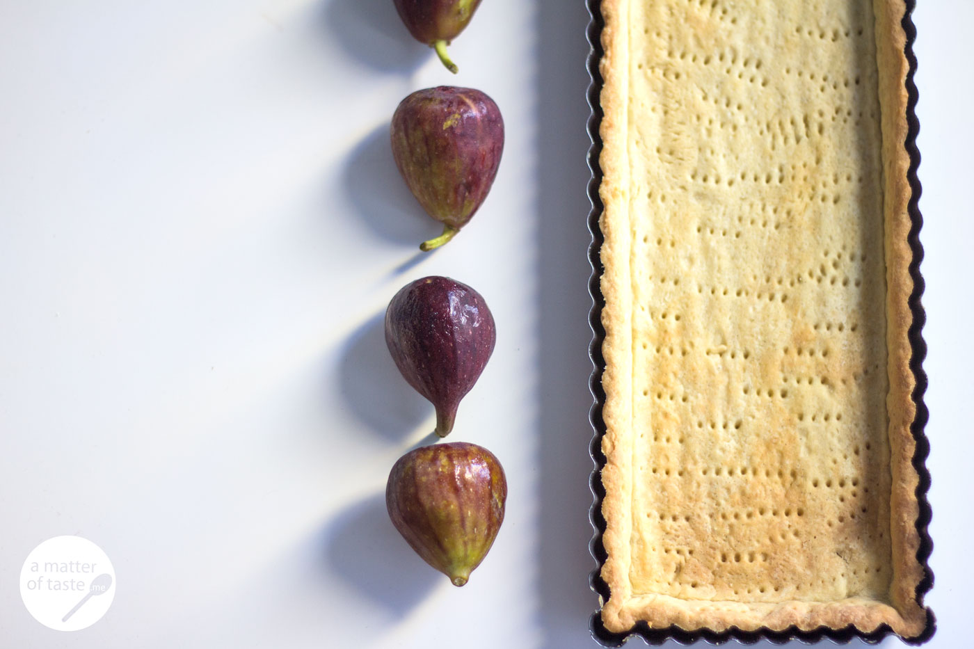 They are available all year round, but are at their best now. That’s why after visiting our local farmers market I came back with a handful of them. Cutting one in half revealed a vibrant purple flesh and it just needed to be displayed. Delicious, sweet tart, topped with pretty figs and a bit of honey – yes, I knew instantly what I wanted to bake.
