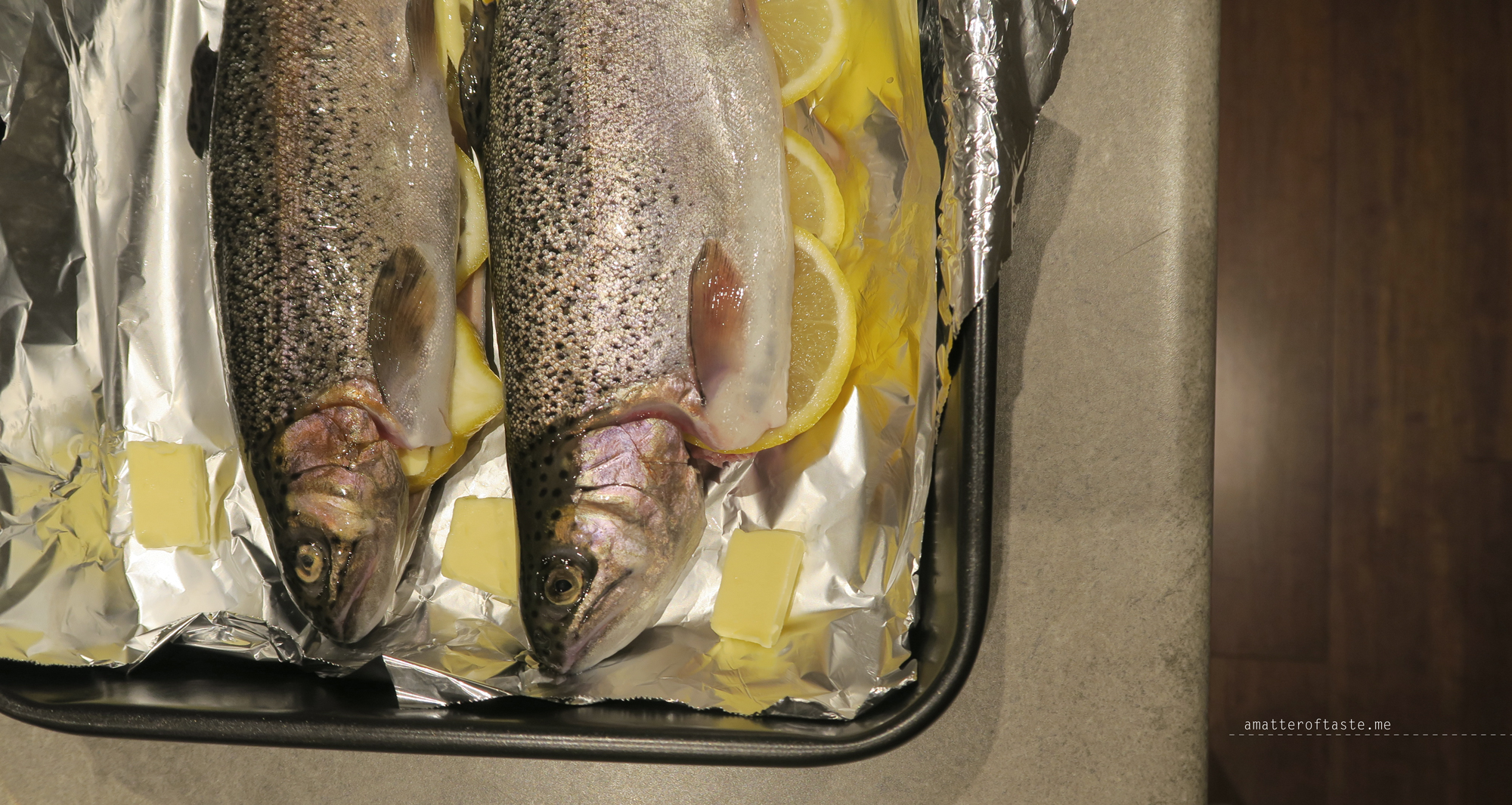 2. Place the fish on a baking tray. Season the inside and outside of fish with salt. Fill each with 1 tbsp of butter and slices of lemon.