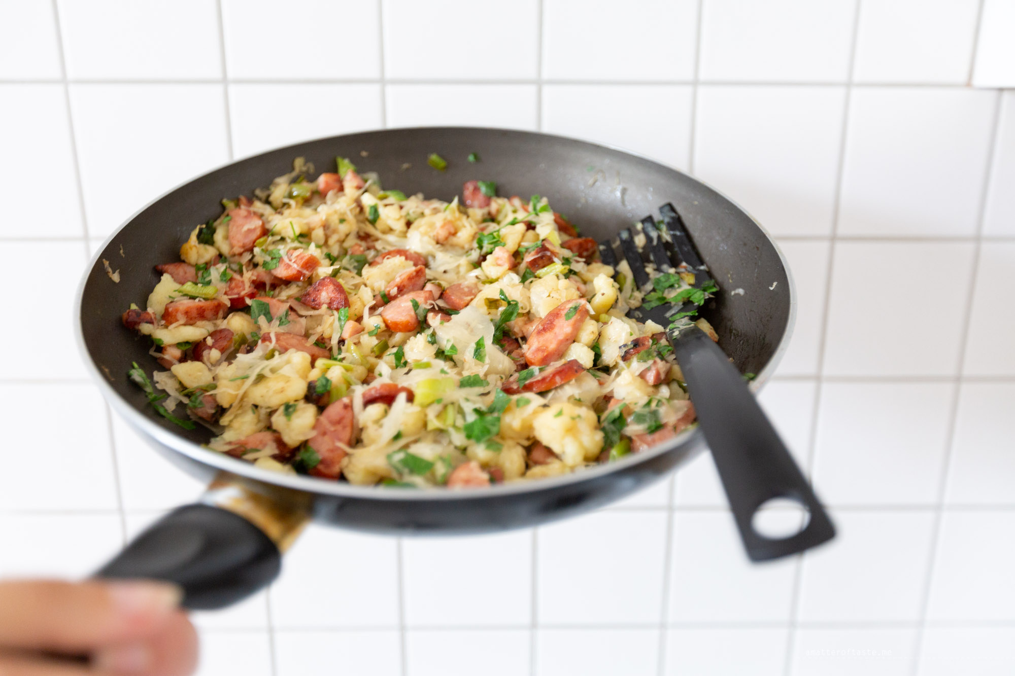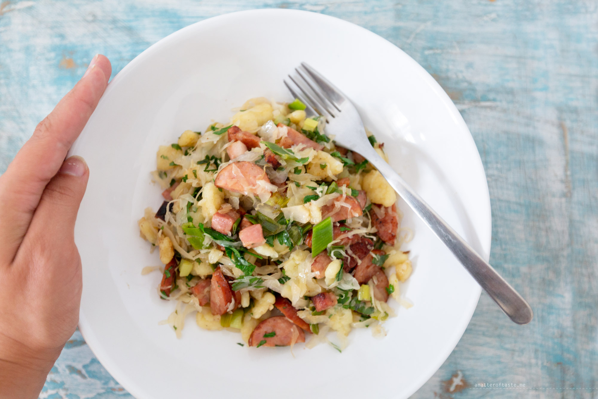 - Add the sauerkraut and halušky. If you’re using gnocchi, put them in a pot of boiling water for 3 minutes before adding them to the pan. Mix until well combined and warmed through.