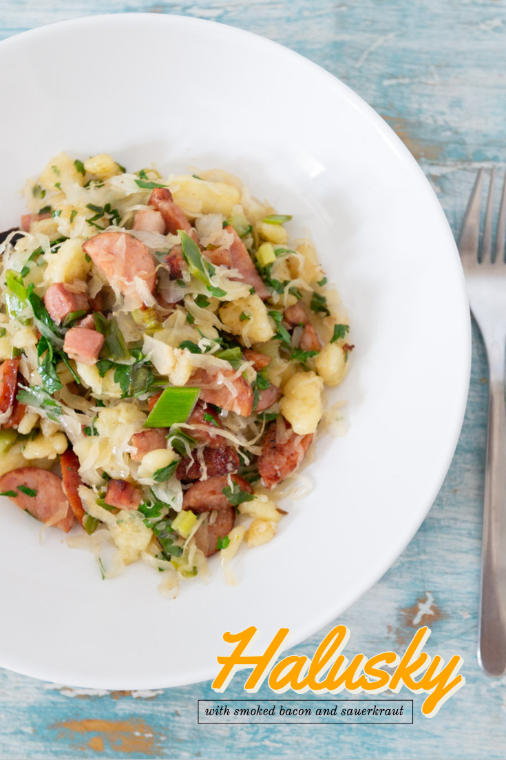 I had a go at recreating it at home but it wasn’t perfect, so I adjusted the recipe and it was a hit. It’s a nicely balanced mix of textures – soft halušky and a bit of crunch from the green onions – and flavours – a bit of sour, slightly sweet and smokey. Goes well with a cold beer.