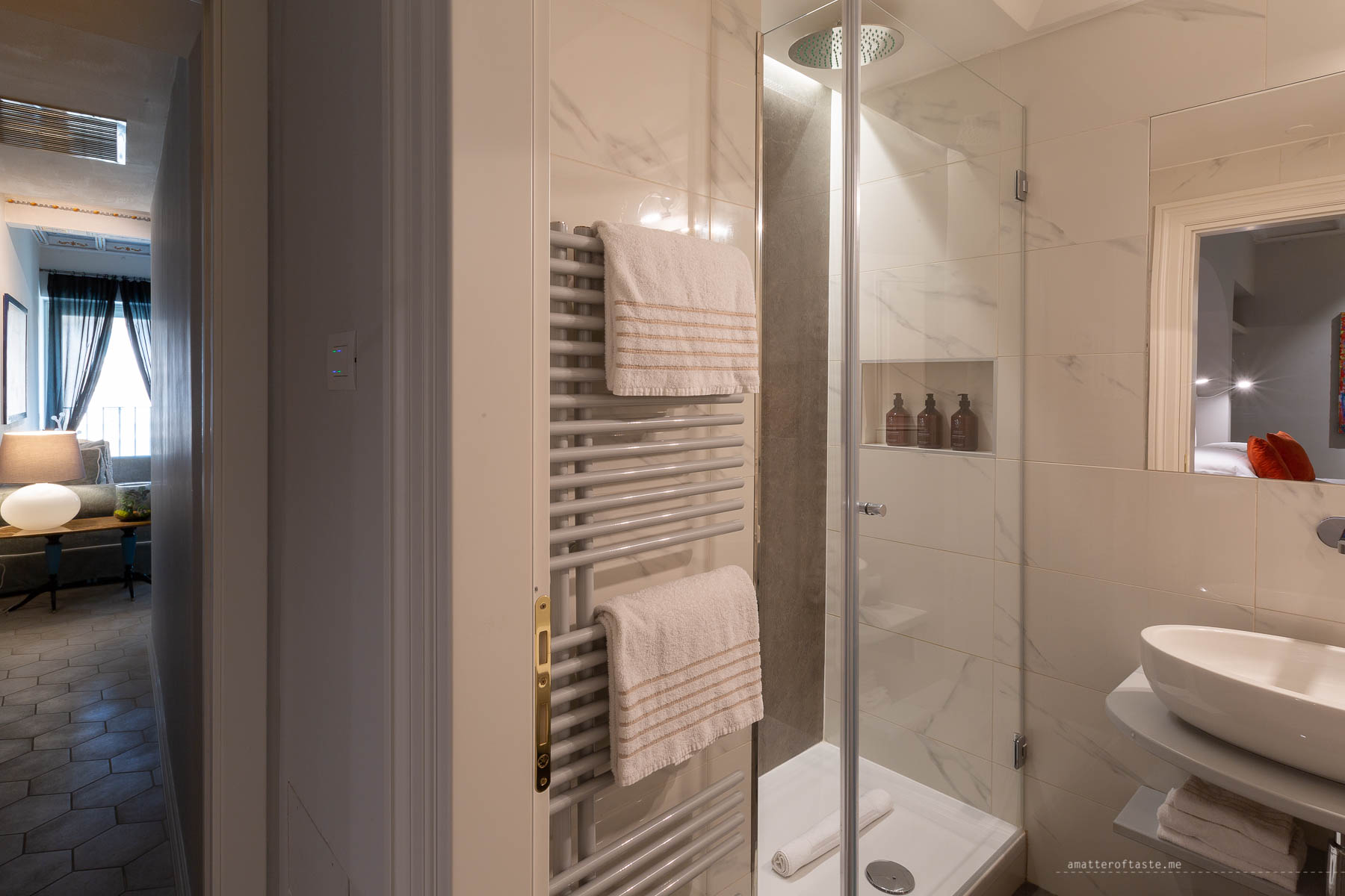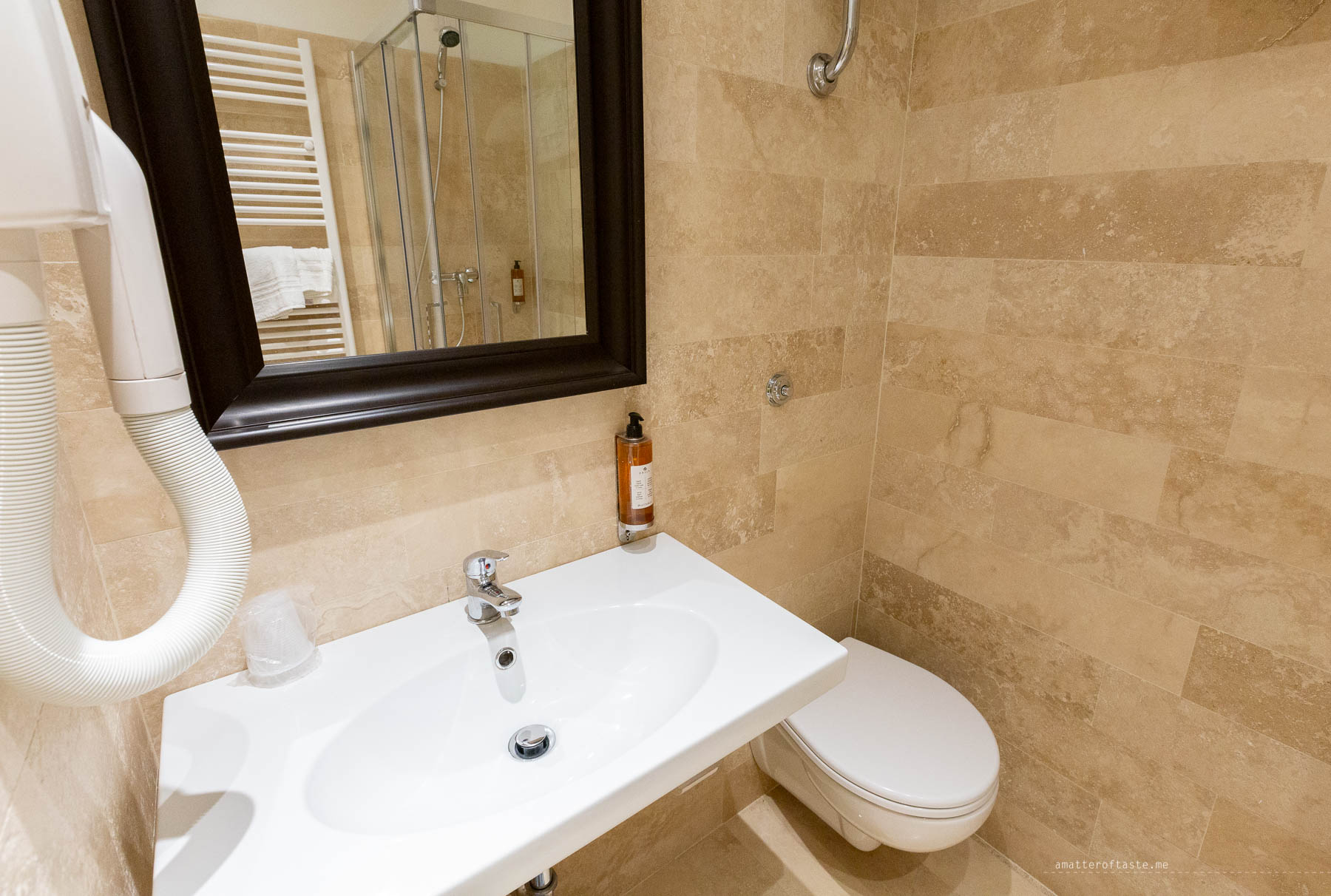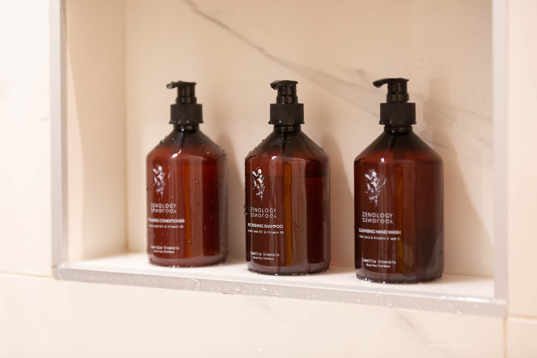 There was a small open wardrobe together with a minibar in the corner of the bedroom and bathrobes waiting for us on the bed. We felt so relaxed from the moment we arrived at the hotel we seriously considered putting them on and staying in. Especially after the shower, which not only had the right water pressure in its rainshower head but also some luxuriously smelling Zenology cosmetics.