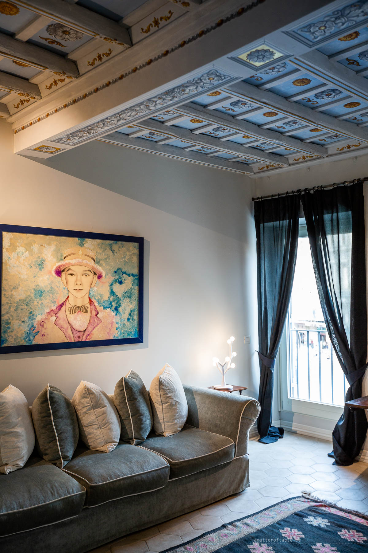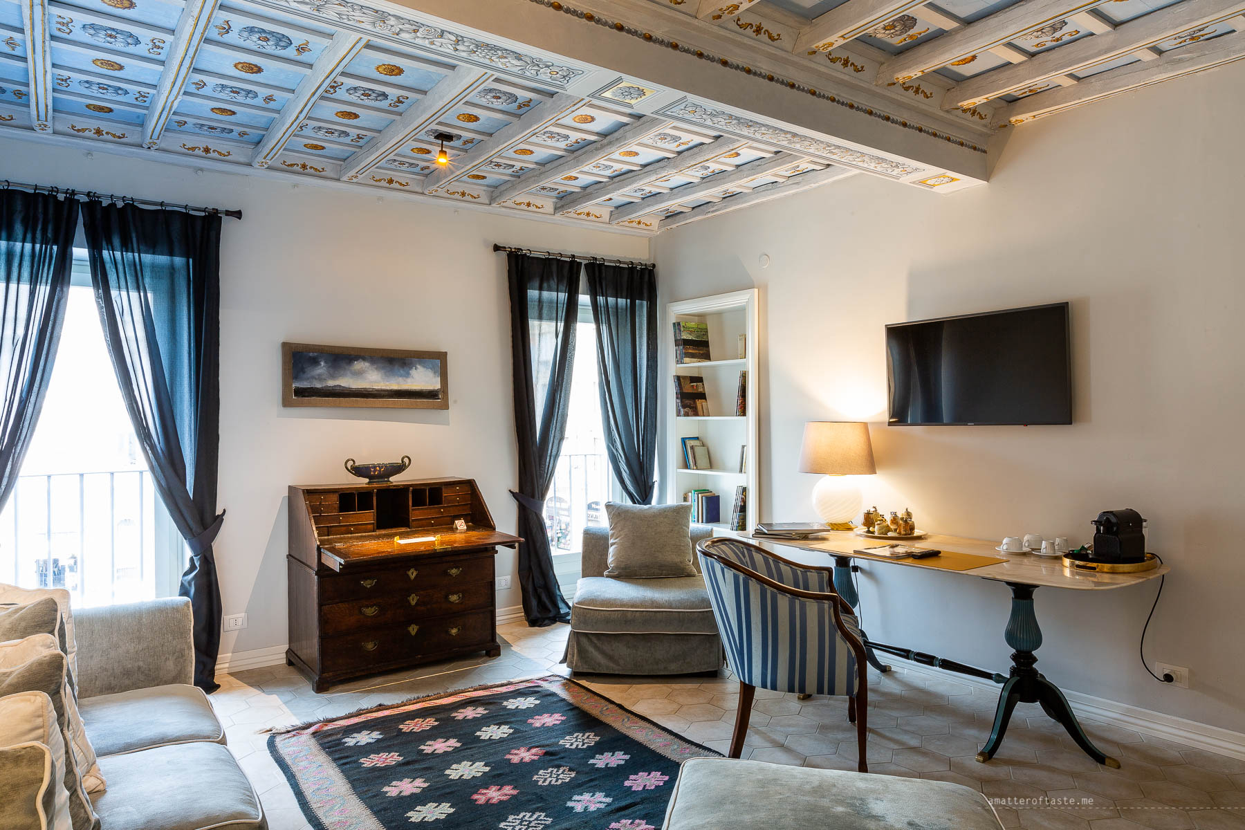 The suite was much bigger than I expected. Its living room area with big windows overlooked one of Rome’s beautiful baroque fountains – Fontana del Tritone. There were more sitting options than we would ever need and a nice, handwritten welcome letter with some chocolates. The furnishings and decorations looked great, especially the intricate wooden ceiling with painted flowers.