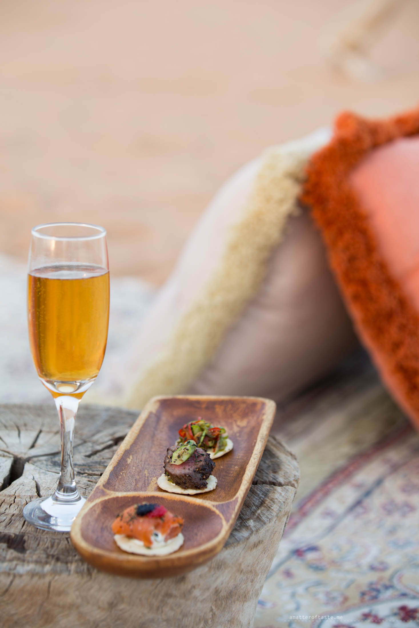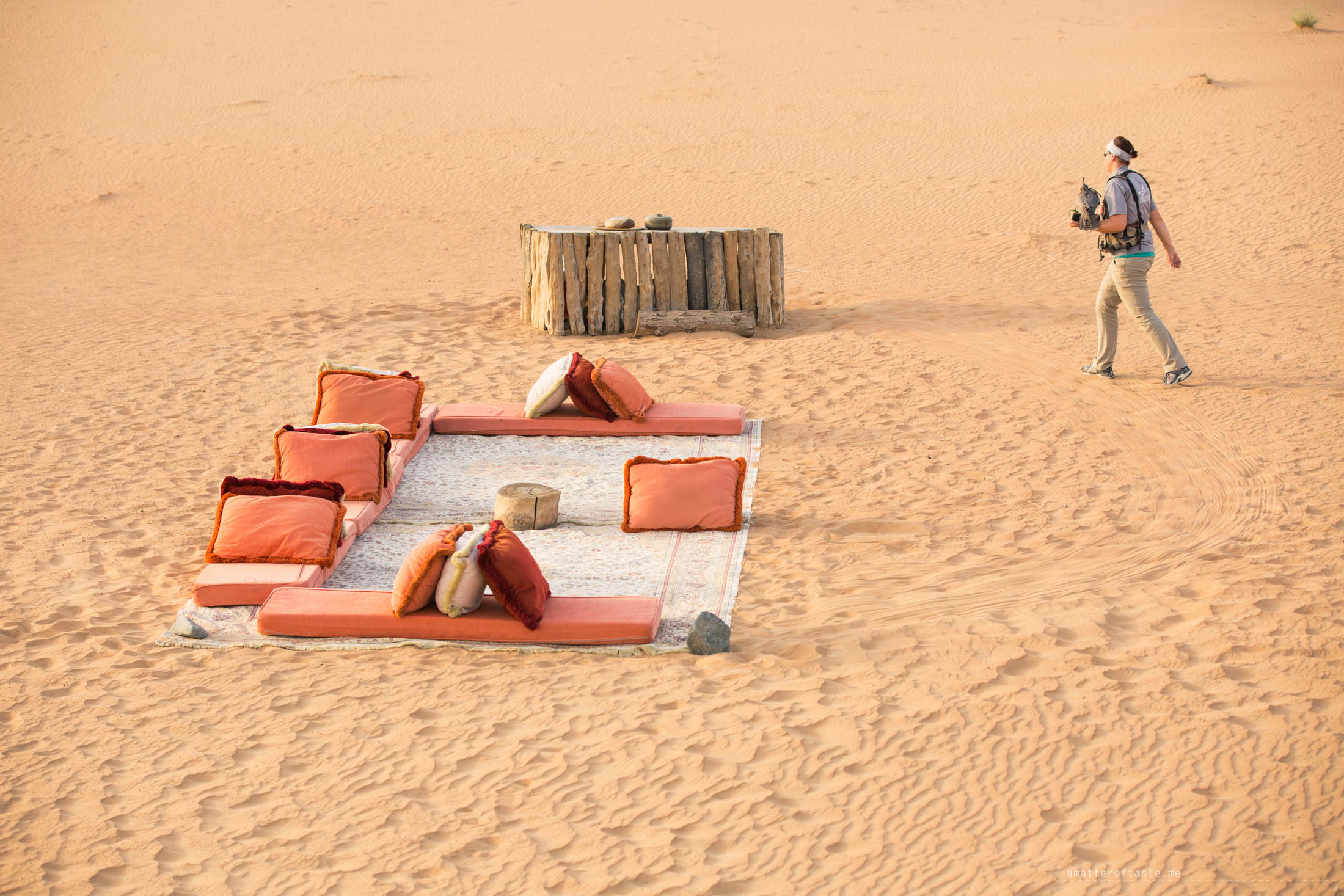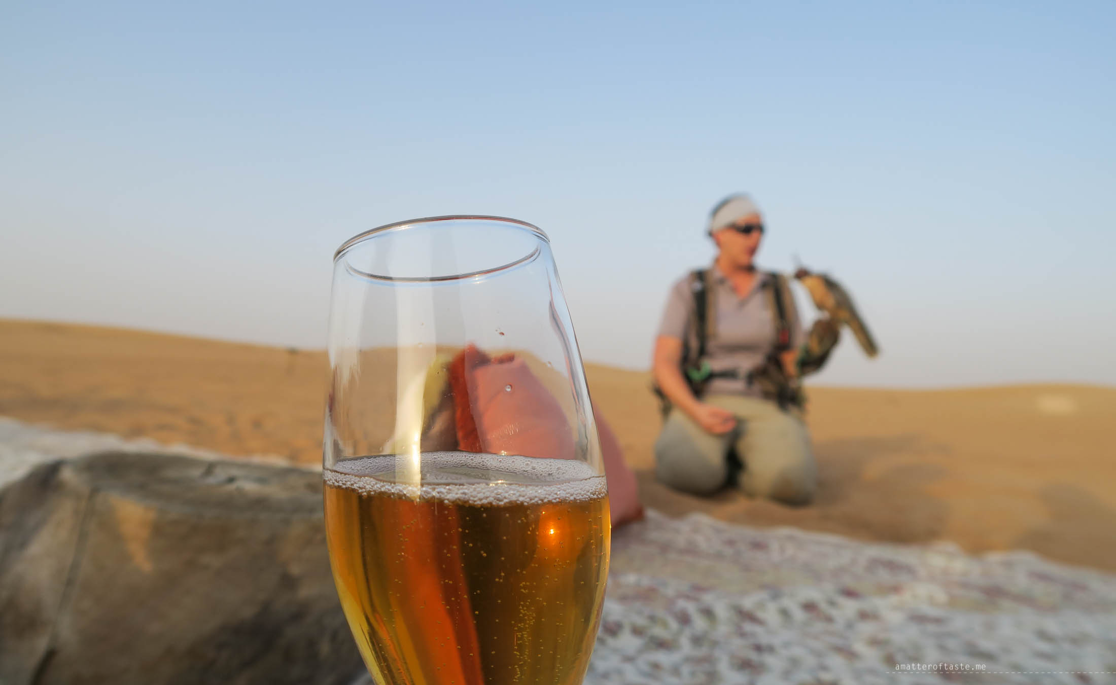 After all the emotions and about 500 photos later, we were brought to an open-air lounge, beautifully set up on the sand. It was time for sunset canapes with sparkling date & apple drink and falconry show. We learned a lot about how the Bedouin used to capture and train falcons. The informative session was followed by prey catching show and Summer the falcon gave us a great performance.