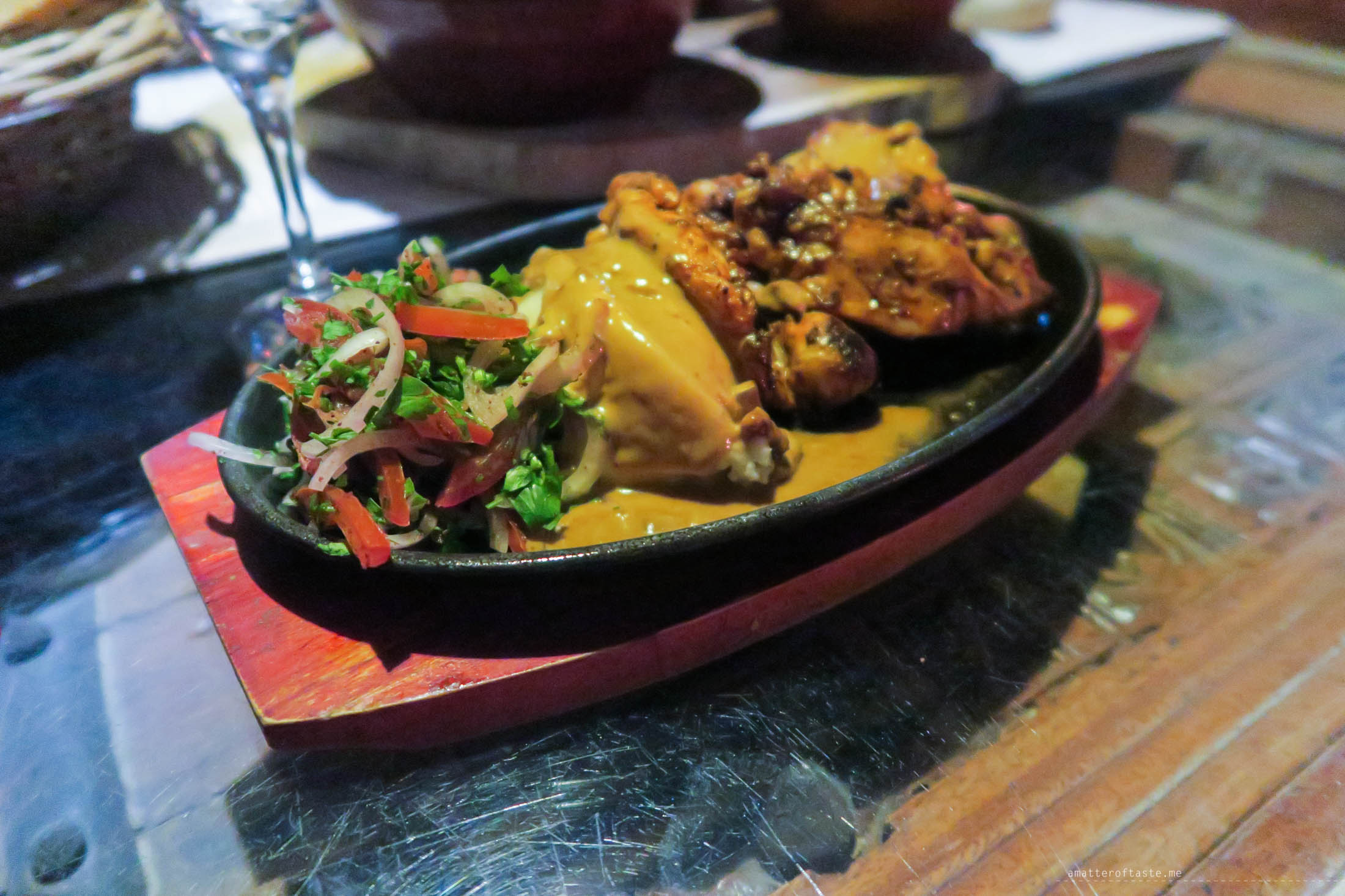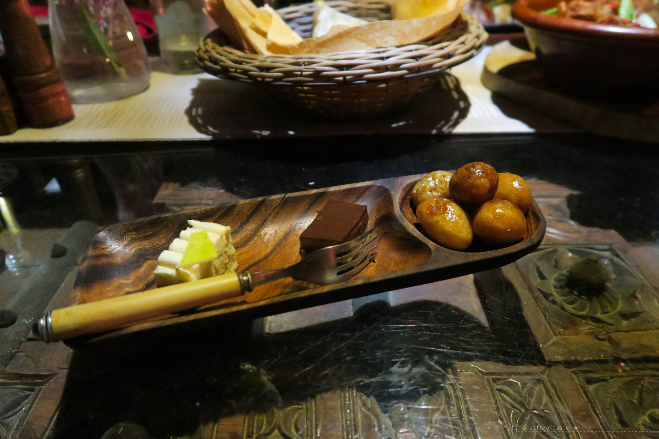 We were welcomed to the oasis in a traditional way, with dates and spiced Arabic coffee. Flame torchlight, sand dunes around us, a small pond in the middle and private tables set around. In that serene, intimate setting we had a scrumptious six-course dinner. Shorbat adas soup followed by salads, kibbeh, hummus, stuffed peppers, selection of breads, spinach sambousek, authentic camel-meat dish and this was just a start. We had a break to watch a dance and get a henna tattoo. And then the spectacular meal, which is prepared and cooked in a desert camp kitchen, continued. For our mains, we chose Australian Angus Steak for Hubby and Arabic Spiced Chicken for me. We were really full by that point but still couldn’t say no to desserts. Especially to legimat – Arabic style doughnuts, drizzled with honey and date syrup.