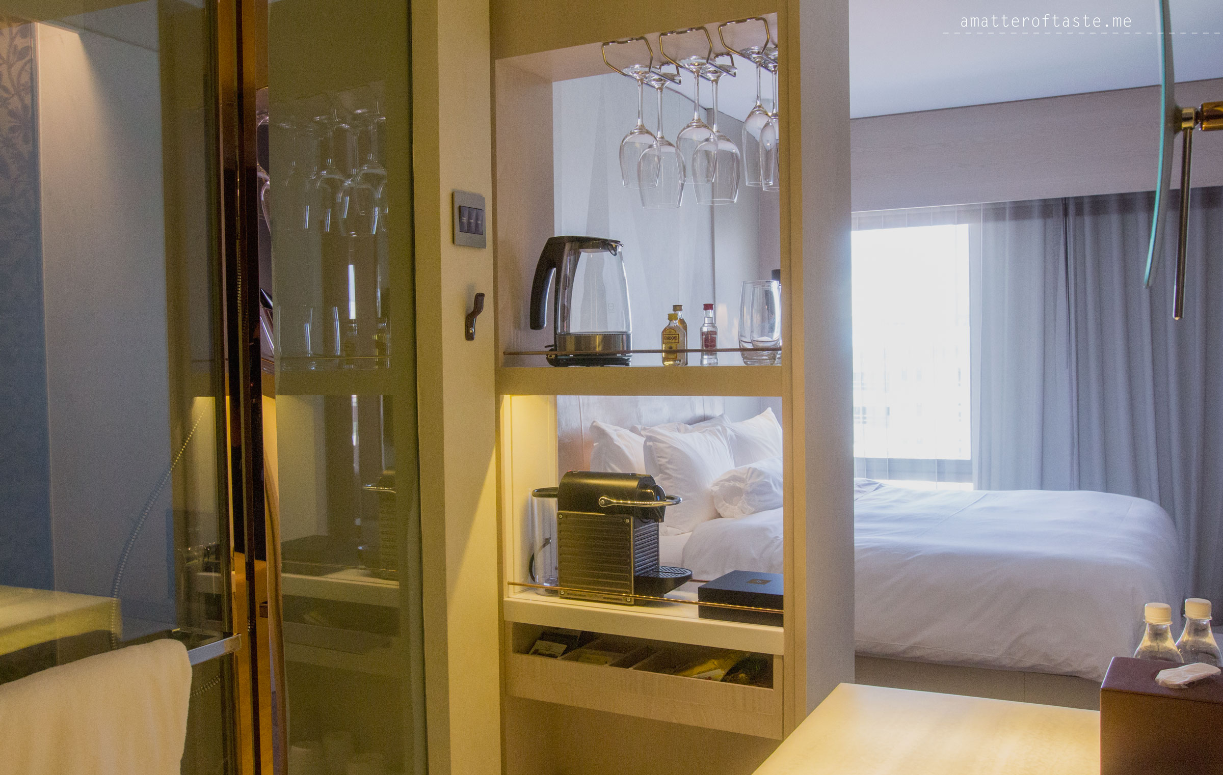 What I admired the most about our room (Habitat Room) was how cleverly designed and arranged such a small space can be. Shower and toilet are divided from the room by a glass wall, which becomes opaque by a touch of a button. Sink, mirror, fridge and some storage space are all in an island-like counter, which stands in the middle of the entrance area. There is also a big shelf, that is hidden in the wall between shower and bedroom area. You can find all the glasses, cups, Nespresso machine and a kettle in there. A tiny desk is also covering a power outlet, that is not only a universal one (so you can use any plug you wish) but also comes with cables for Apple devices and mini usb – yay for something for us, Android users. Opening drawers in the room is almost like a treasure hunt – finding all those thoughtful things is often surprising and you can find more things that you would expect. There is even a yoga mat waiting to be used and you can request a hair straightener to be delivered to the room.