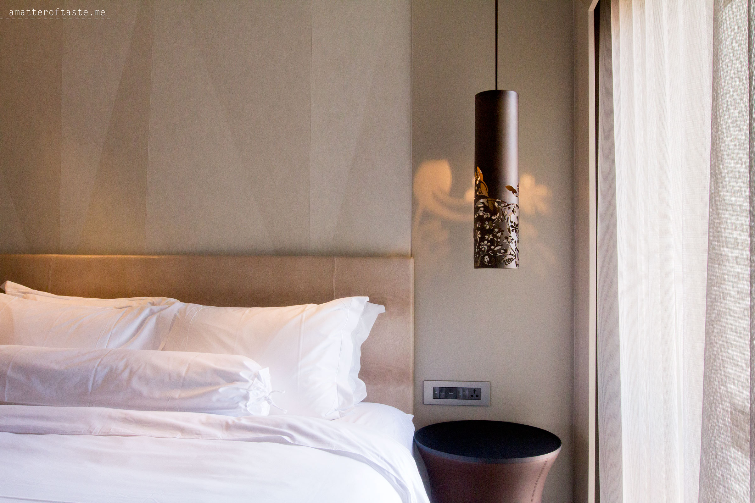 The bedroom area is decorated in a very sleep-friendly way – no distractions, just a bed, soft carpet, wooden floor adding warmth, sheer curtains, earthy tones and a gorgeous pendant lamp that features the Naumi’s signature floral pattern.