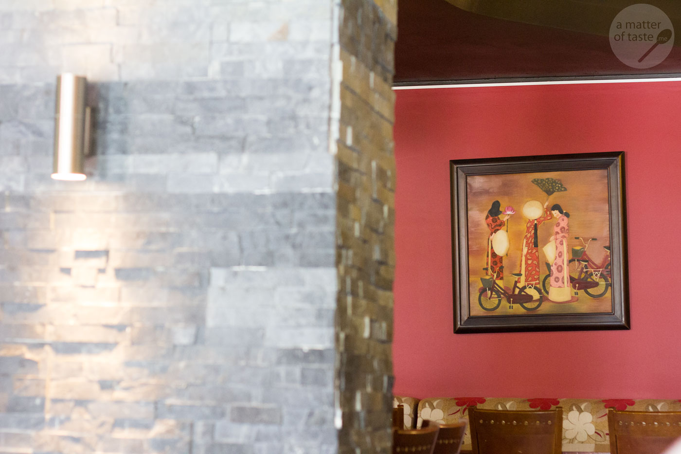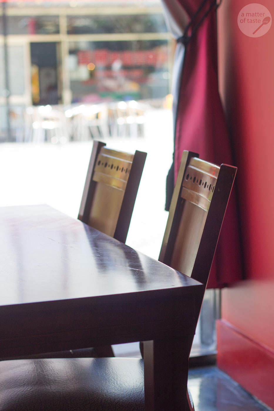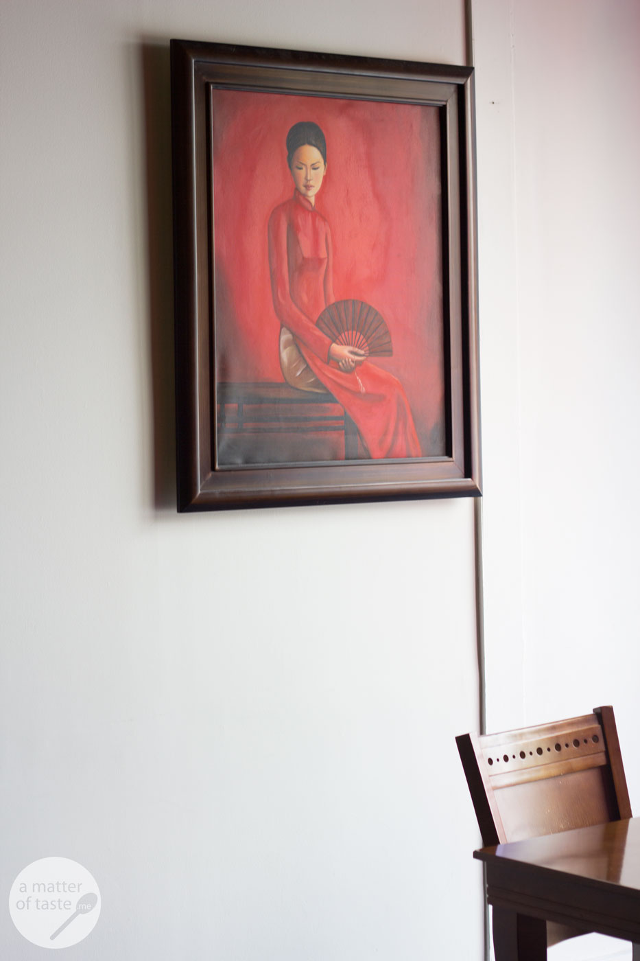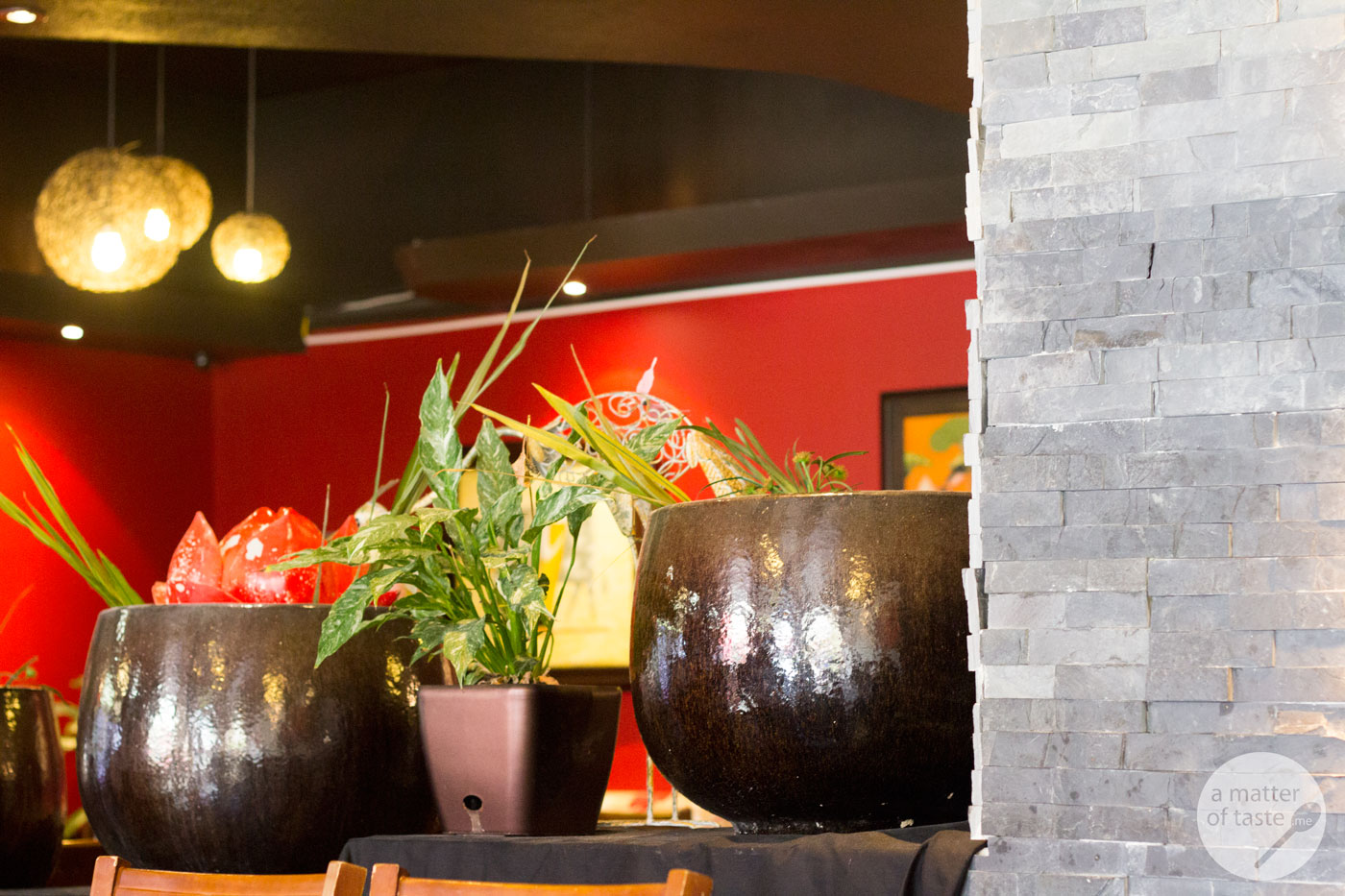 The interior is much nicer than in other Asian restaurants in the neighbourhood. Most walls are red, but it’s not as agressive colour as many people would think it may be. I actually feel like there is a good balance between red walls – art – green plants and dark wood.
