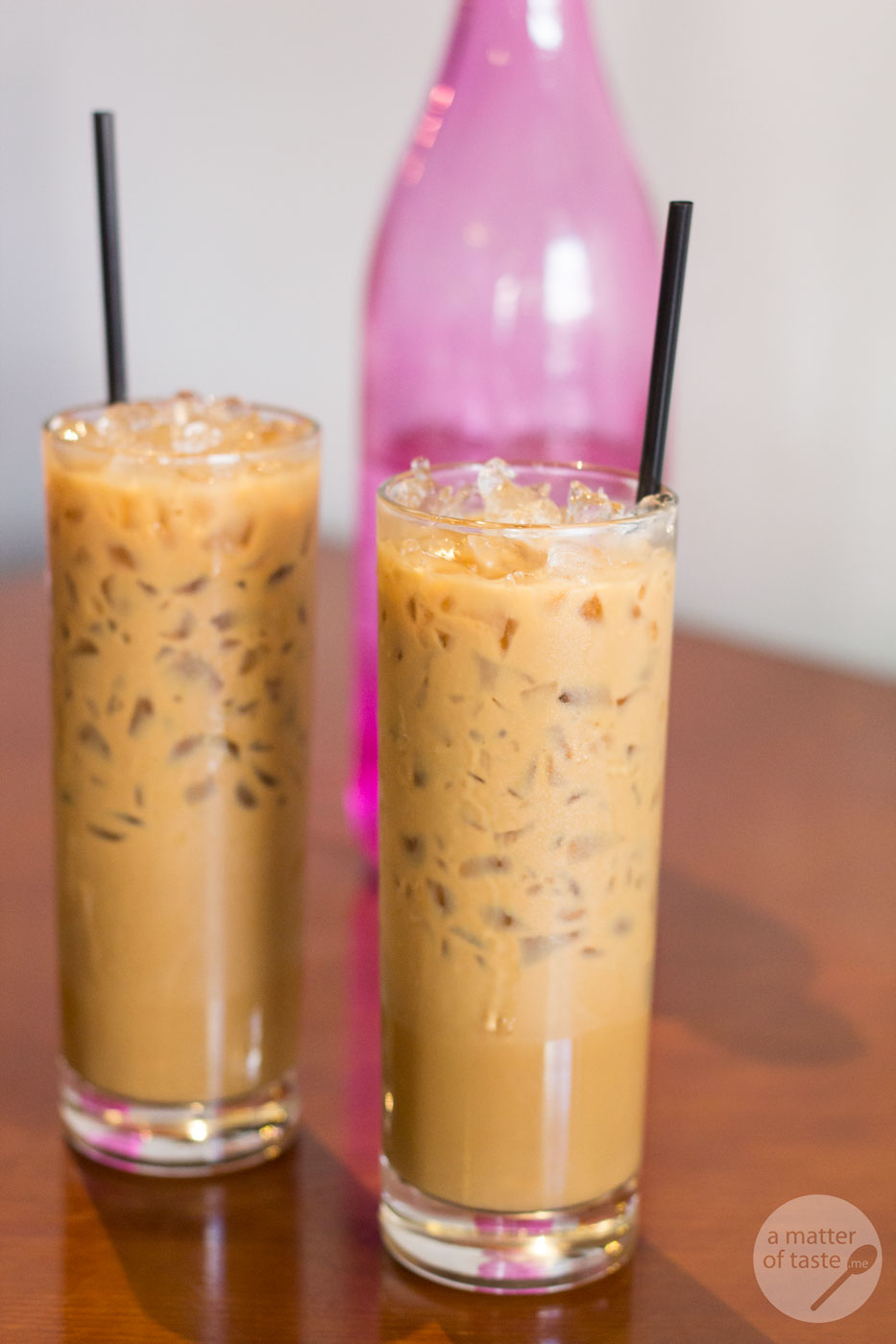 I also enjoy the Vietnamese Ice Coffee ($5). It comes in 2 tall glasses: one filled with ice, the other one with condensed milk and dripping filter on top. When the coffee stops dripping from the filter, you have to mix it with the milk and pour over ice. It was surprising for me at first, but the coffee is actually quite strong.