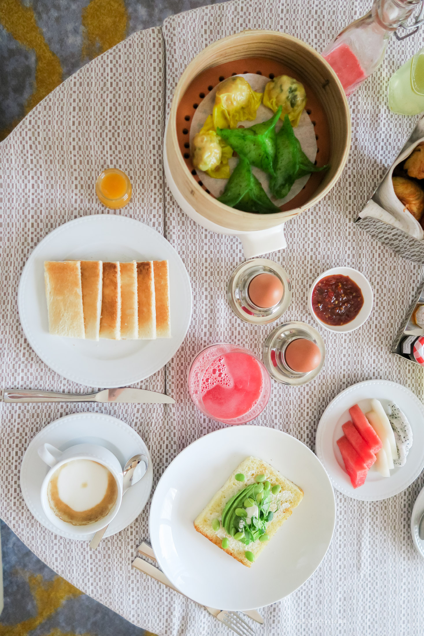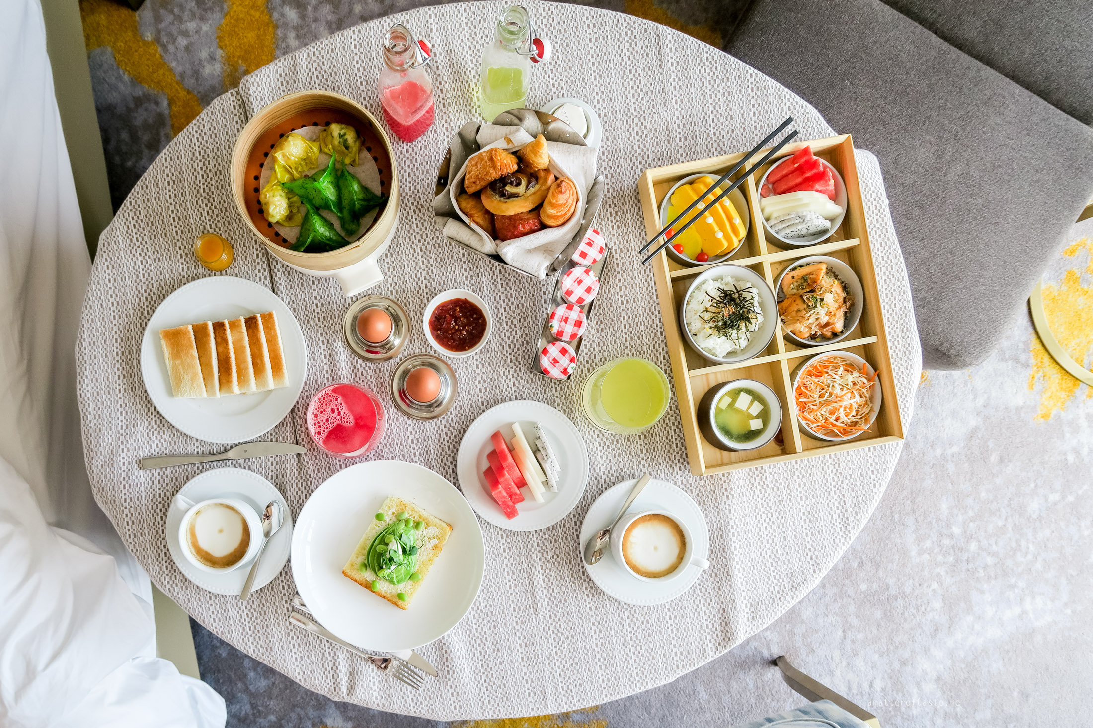Speaking of breakfasts – we had a lazy Saturday morning and got our breakfast delivered to the room. It was a battle of breakfasts: Japanese (a box of rice, pickles, fish, miso) vs Singaporean (dim sum and kaya toast with soft boiled eggs) plus a cheeky avocado on toast (because you can take me out of Melbourne but can’t take Melbourne out of me). The dishes came with freshly squeezed juices and coffee and were impressively delivered to the room not spilled and at the right temperature. The battle of breakfast didn’t come to any conclusion other than it ended with a tie. I loved my kaya toast and eggs and Hubby wouldn’t change anything in his Japanese breakfast. If you’re ordering room service breakfast you may need to order both breakfast sets and try to decide yourself (and don’t forget to let me know how it went!).