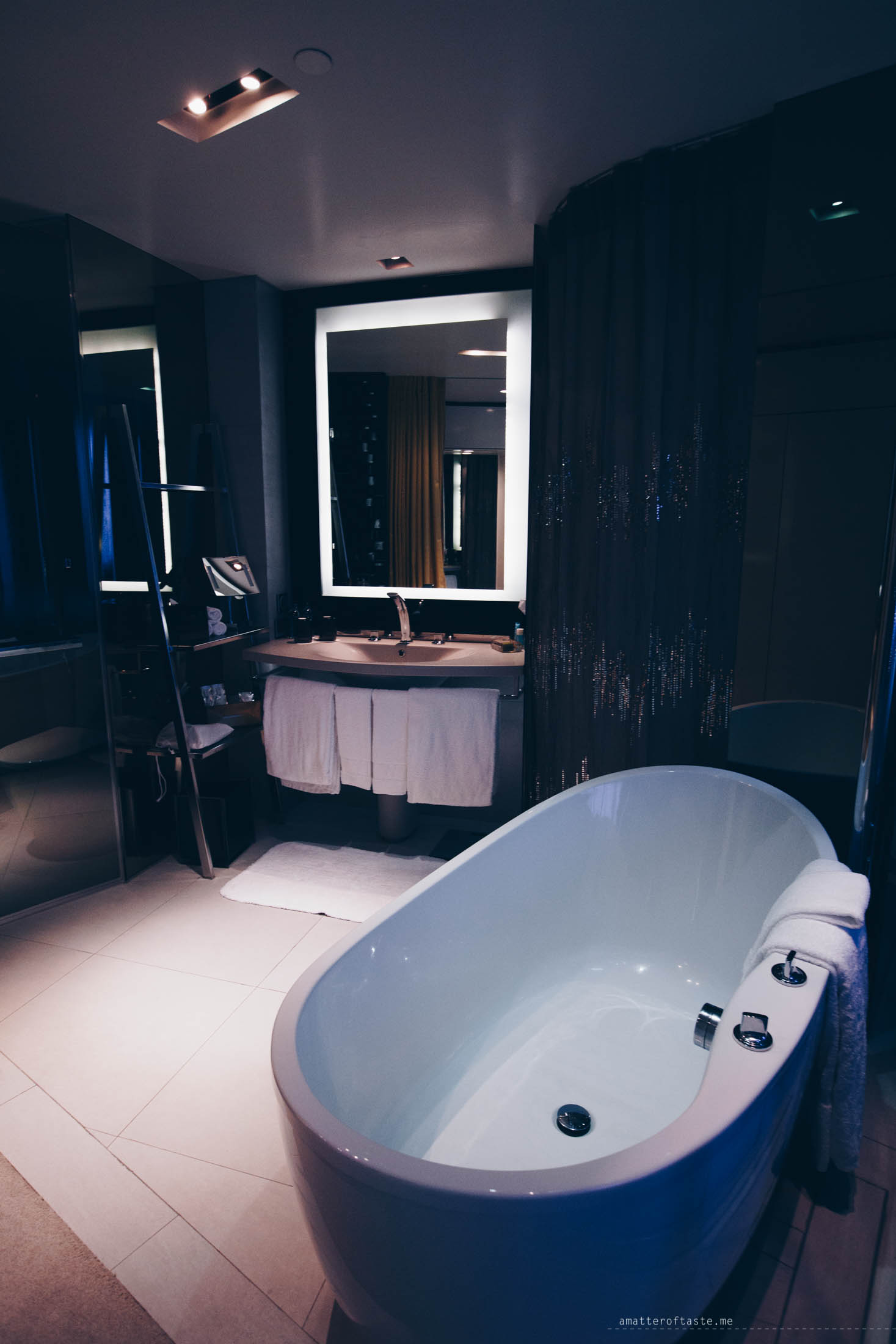 The bathroom was well designed, with the toilet behind a door and large shower fitted in the corner. The curtain, instead of a wall, separating the bathroom area from the rest of the room was ok for me but I wouldn’t be too keen on it if I was sharing the room with someone else. The translucent coloured glass wall was a cool addition too as it allowed some natural light in the dark bathroom and added colour to it. Ah, and the most important feature – the freestanding bathtub. A perfect remedy for jet lag.