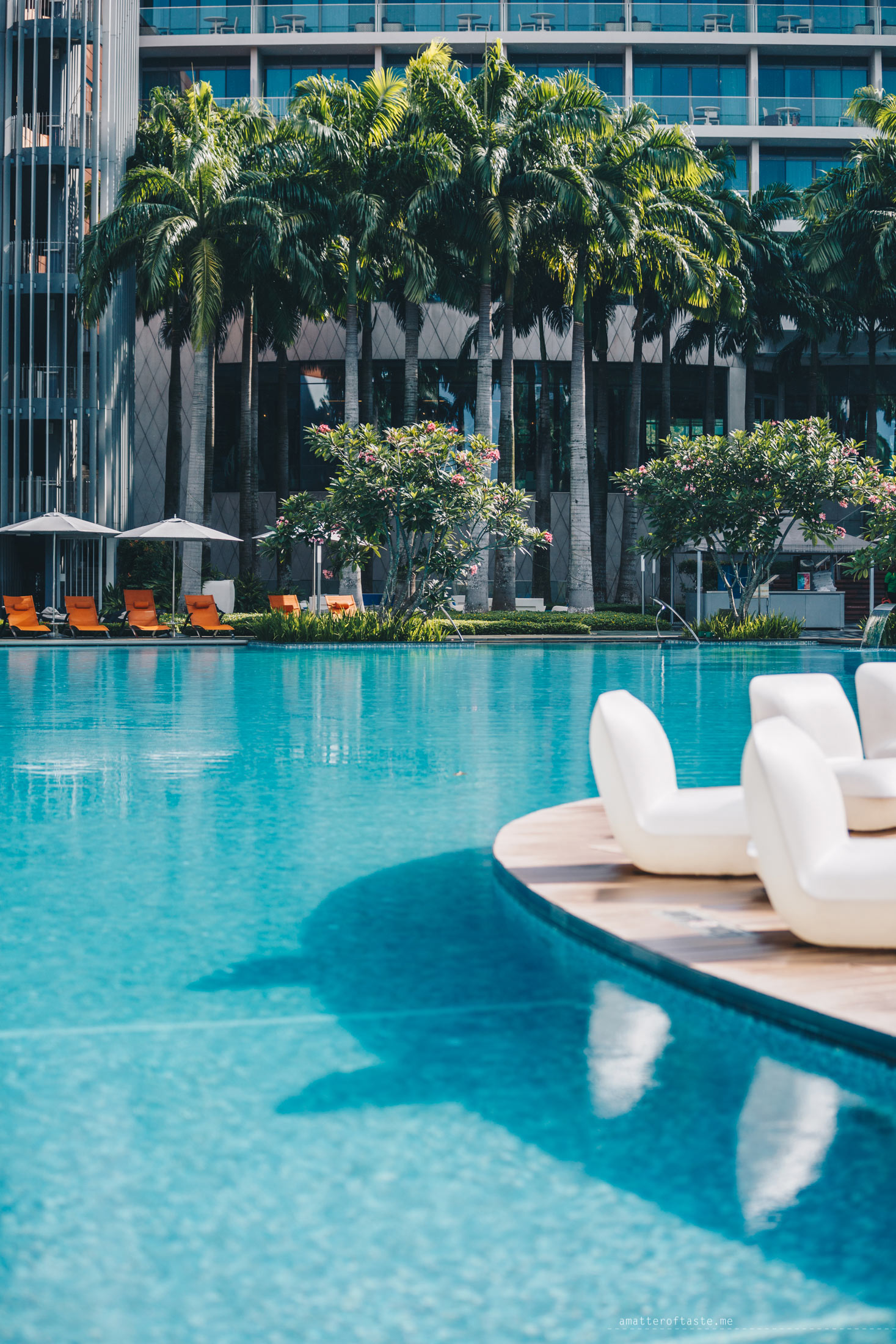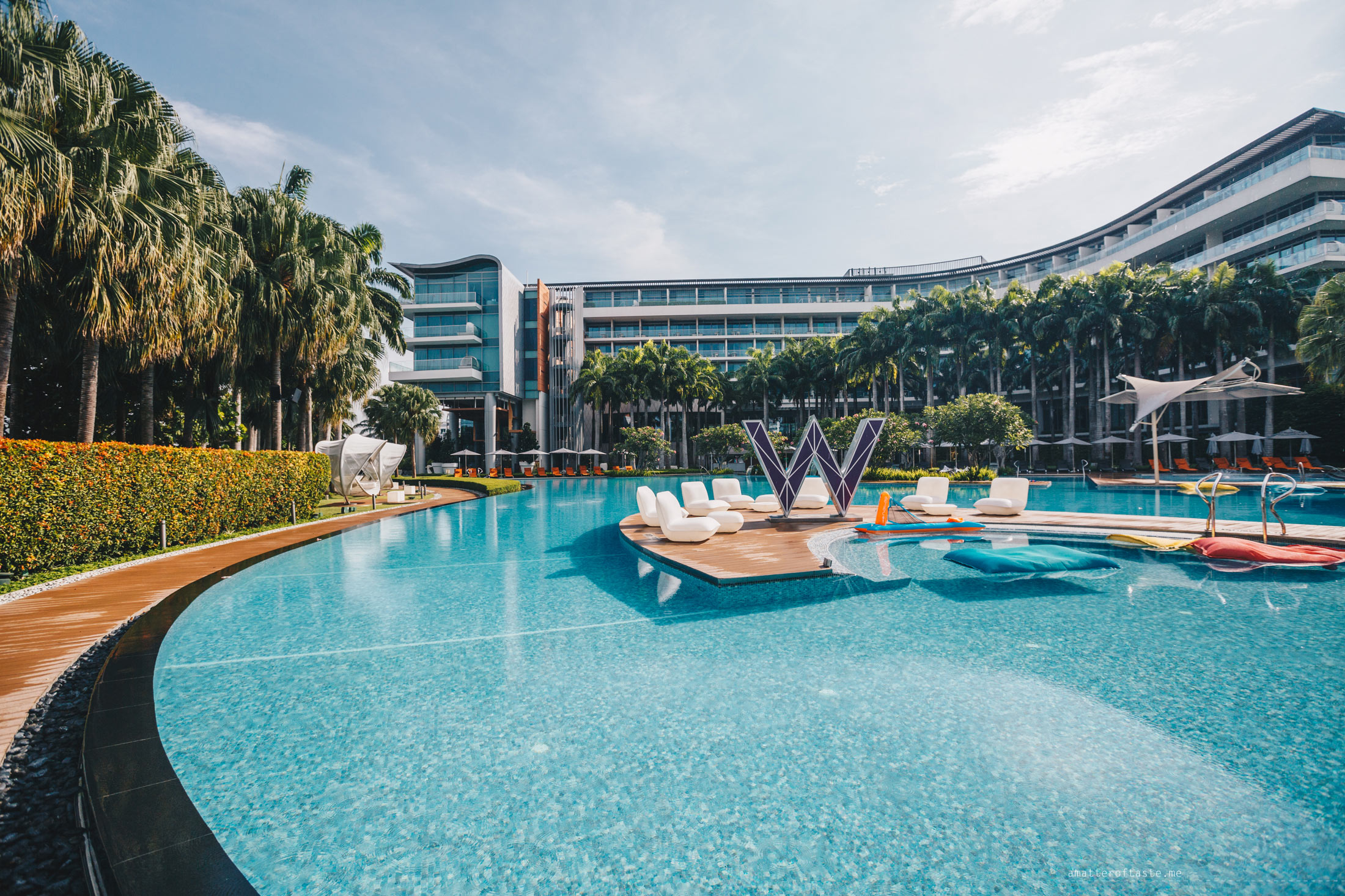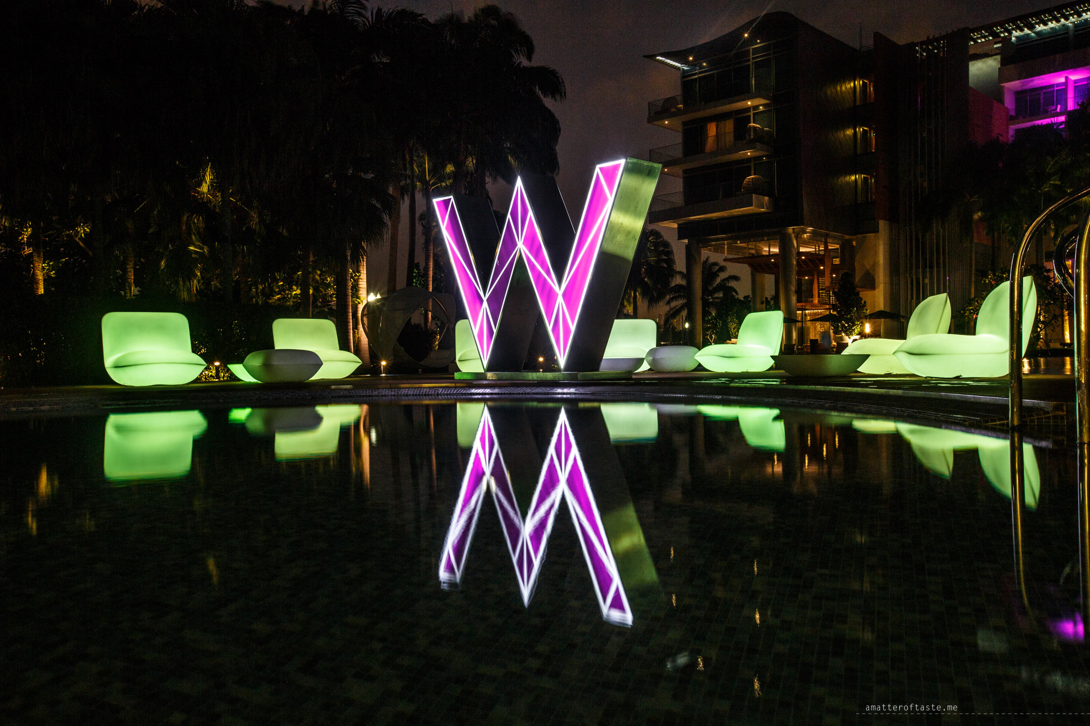 The W Singapore is set in a quiet corner of the Sentosa Island with marina and residential buildings around it. Surrounded by lush greenery and palm trees the hotel feels really secluded and it’s easy to forget about all the hustle and bustle of the big city. At the same time, it’s only about 20 minutes & SGD18 by taxi to the CBD.