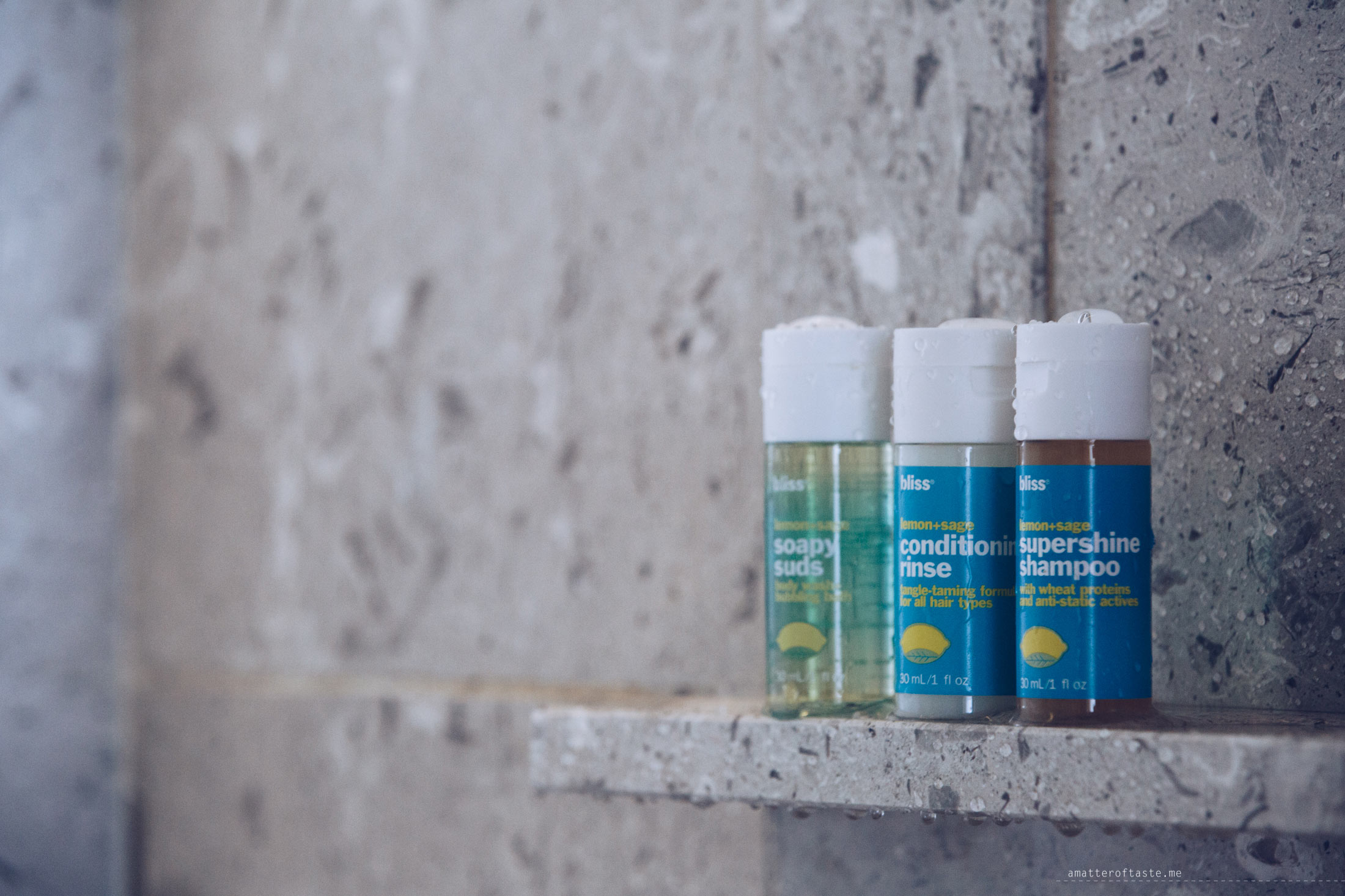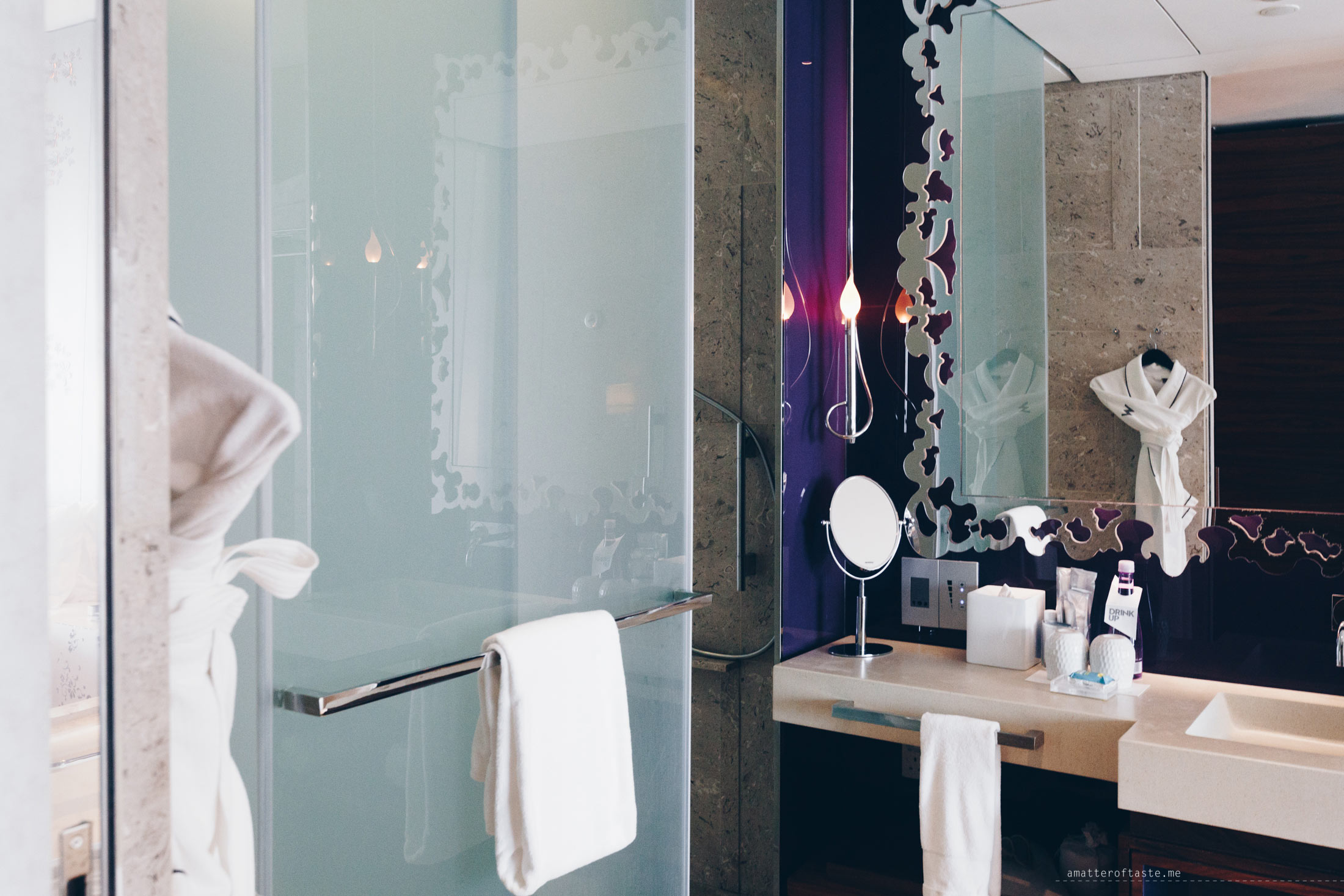 When I finally go back to the room it’s almost completely dark outside. After spending so many hours in the pool, the bathtub doesn’t look that appealing anymore but the shower is definitely needed. Delicate rain shower, Bliss cosmetics and a fluffy robe make me feel like I’m in a spa. I turn on the purple mood lighting and almost want to say it’s time to sit back and relax but I’ve been relaxing since 1 pm (yay for early check-in!).