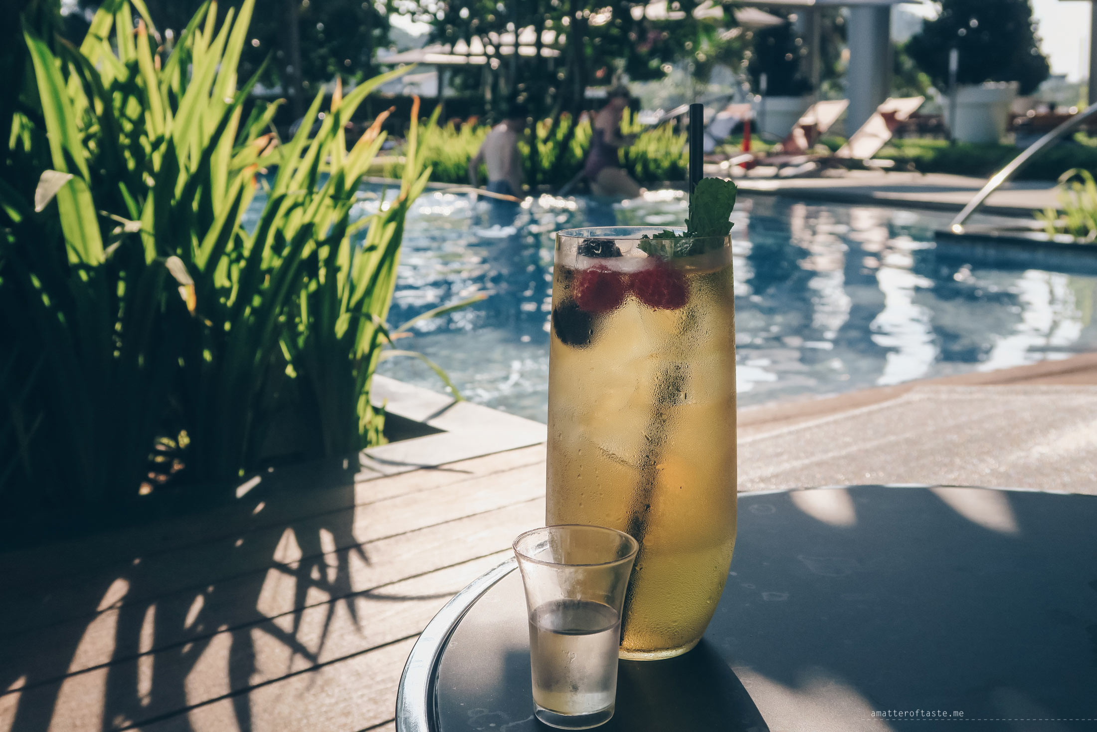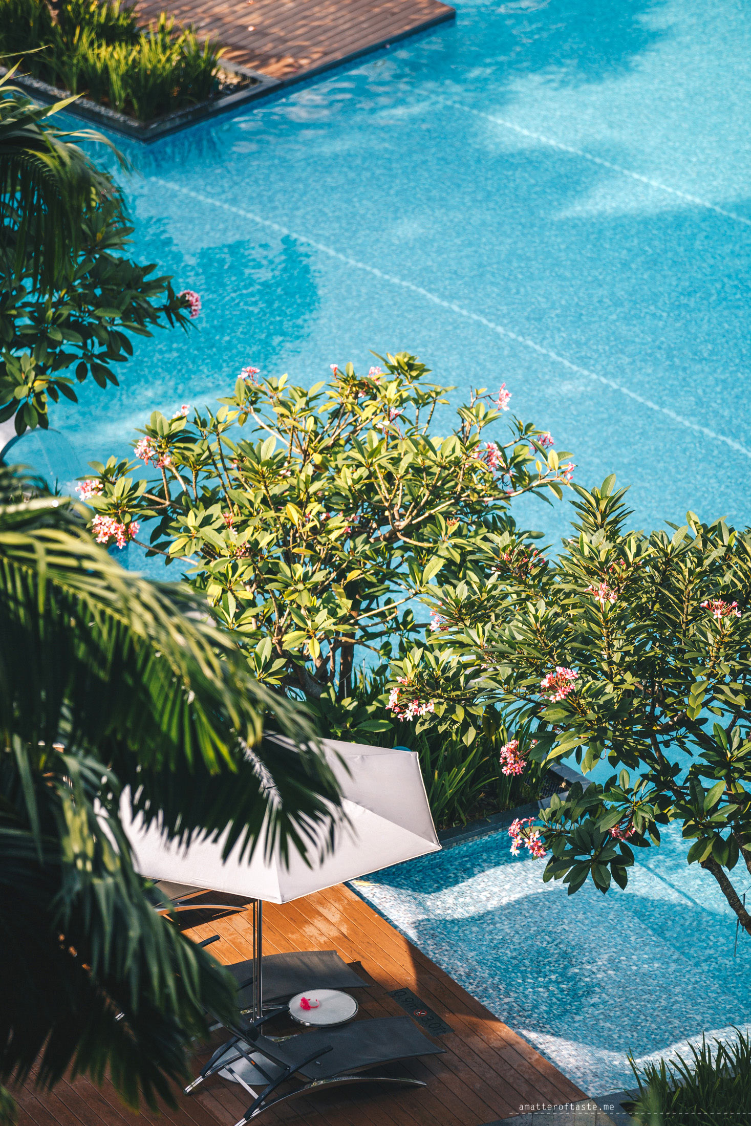 It may be time for lunch – it crossed my mind a couple of times while I was floating on a huge yellow pillow in the middle of W Singapore’s pool without a care in the world. Nah, I only just came here – I kept telling myself and went for a cocktail in the swim-up bar instead. Now, the afternoon light turned everything golden and it looks like it may be my last chance for “lunch” before it gets dark and the pool service closes for the day. I reluctantly make my way back to a sun lounger and as it turns out it is almost 5 pm.