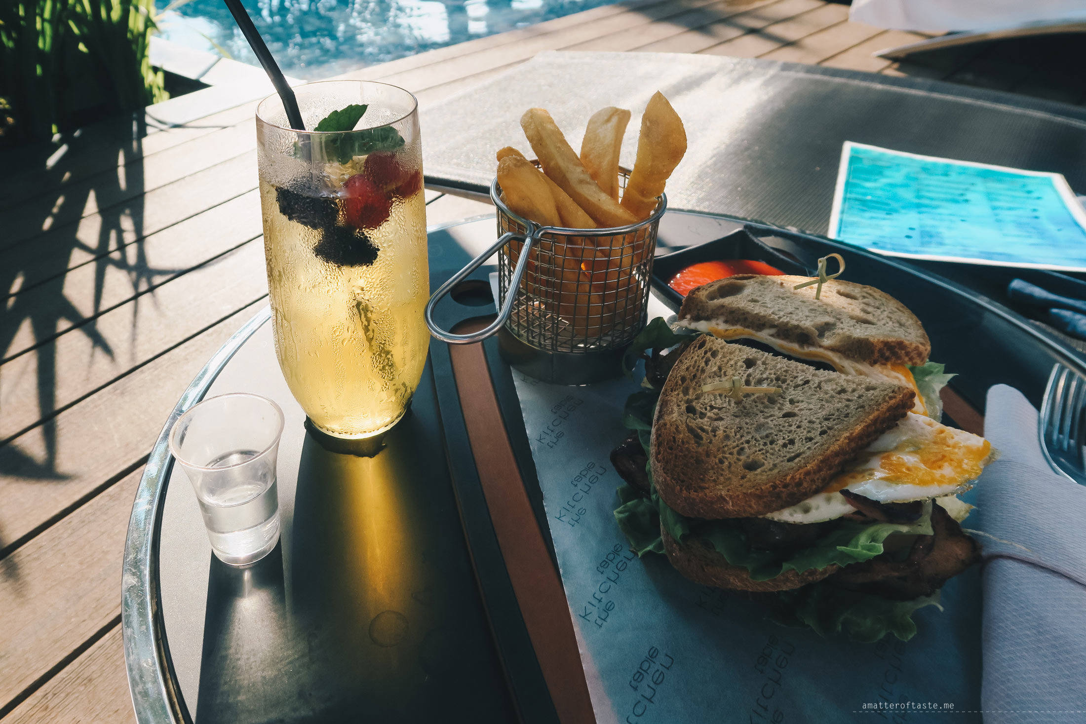 This is the laziest and the happiest afternoon I had in a while. I really don’t need much. Hot, humid day and a big pool pretty much all to myself. Every Monday should look like this. I place my order for a sandwich and another cocktail and the nice waiter informs me it will be about 20 minutes, so I roll back to the pool where my yellow floating pillow is waiting for me. I want this moment to last forever.
