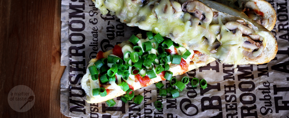 Blanch mushrooms with a bit of pepper and salt. Put them on halved and buttered baguettes, cover with grated cheese. If you’re using ham, place it under the cheese layer.